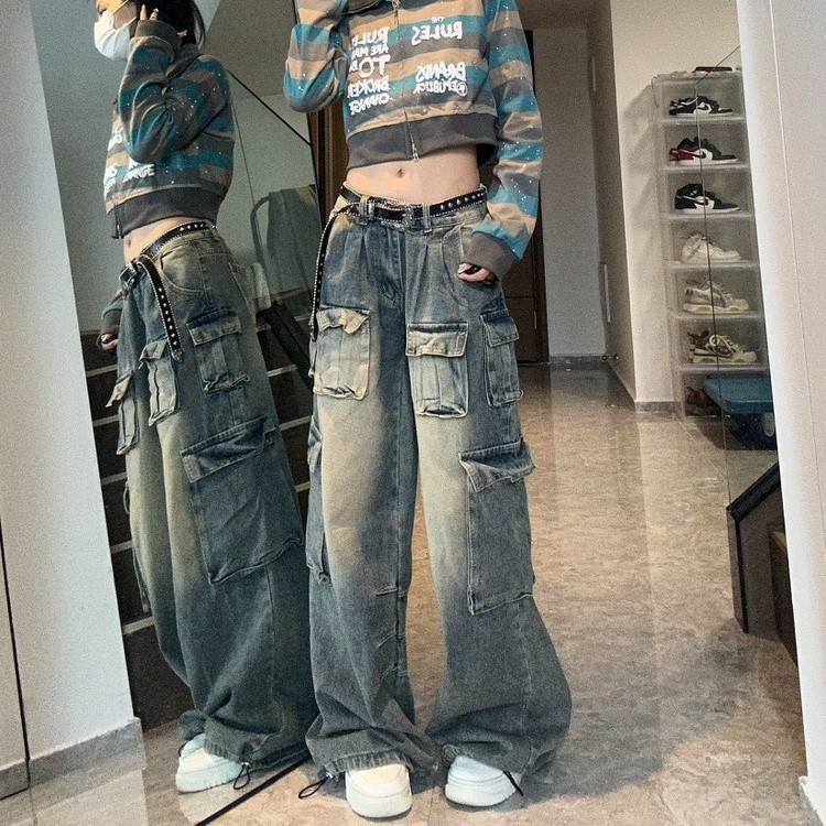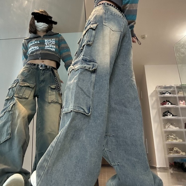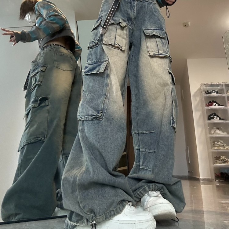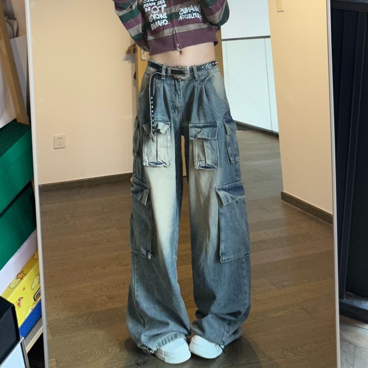 American Multi-pocket Workwear Jeans Women's Wide Leg Loose Washed Distressed Pants