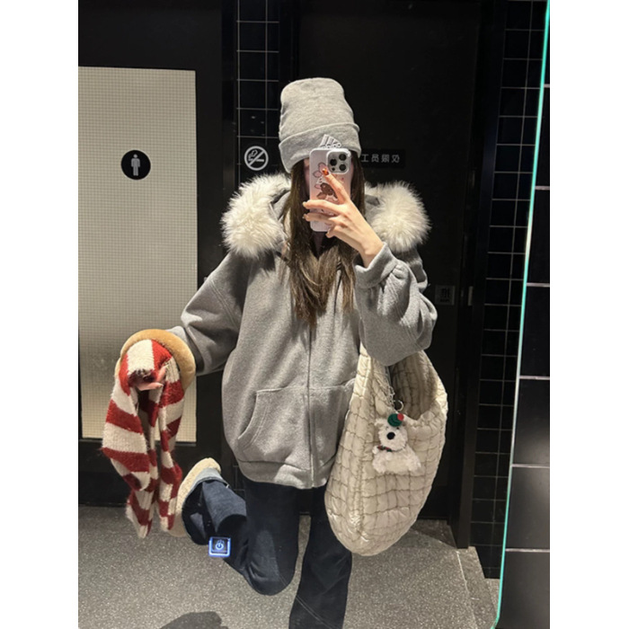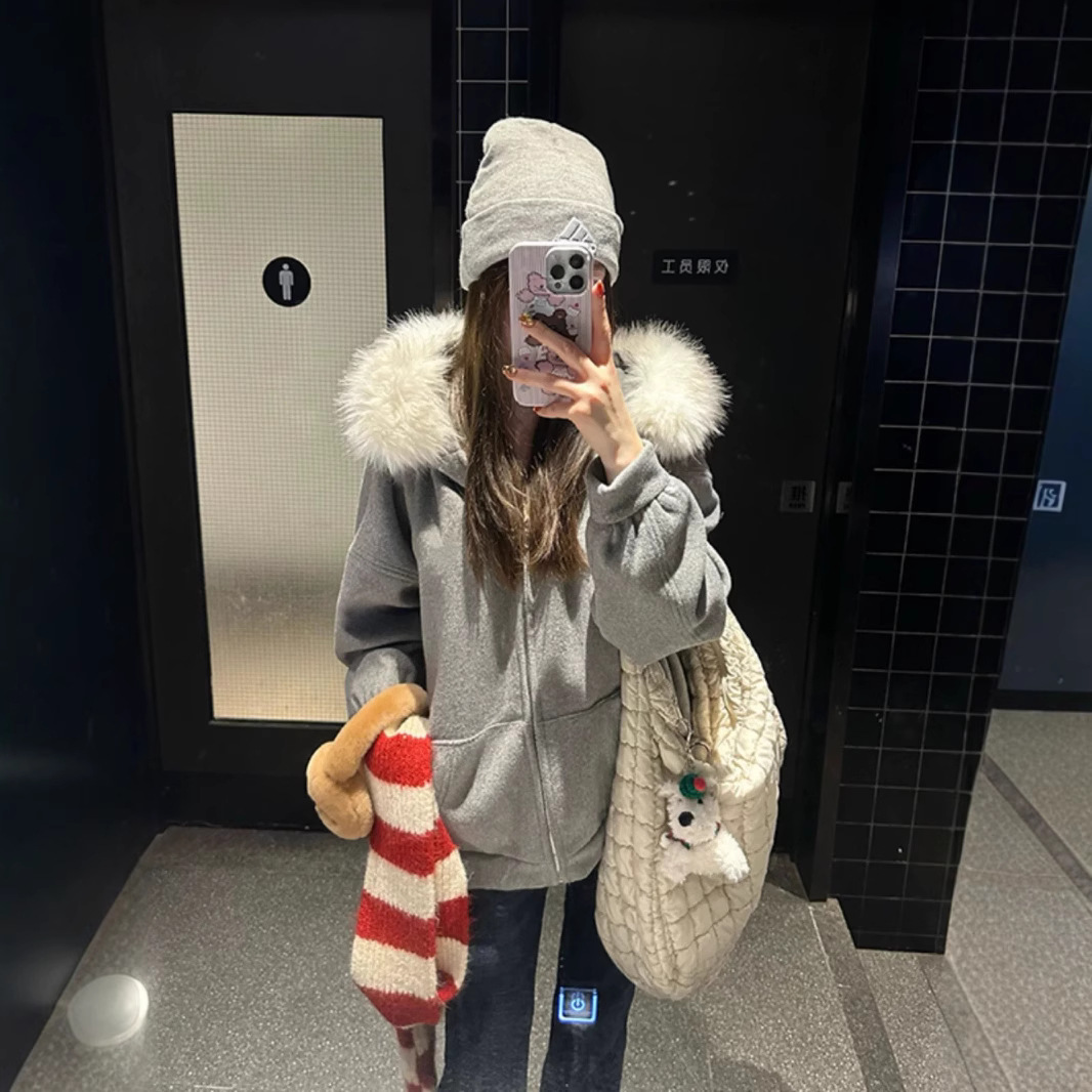 American Retro Fur Collar Hooded Cardigan Sweater Women