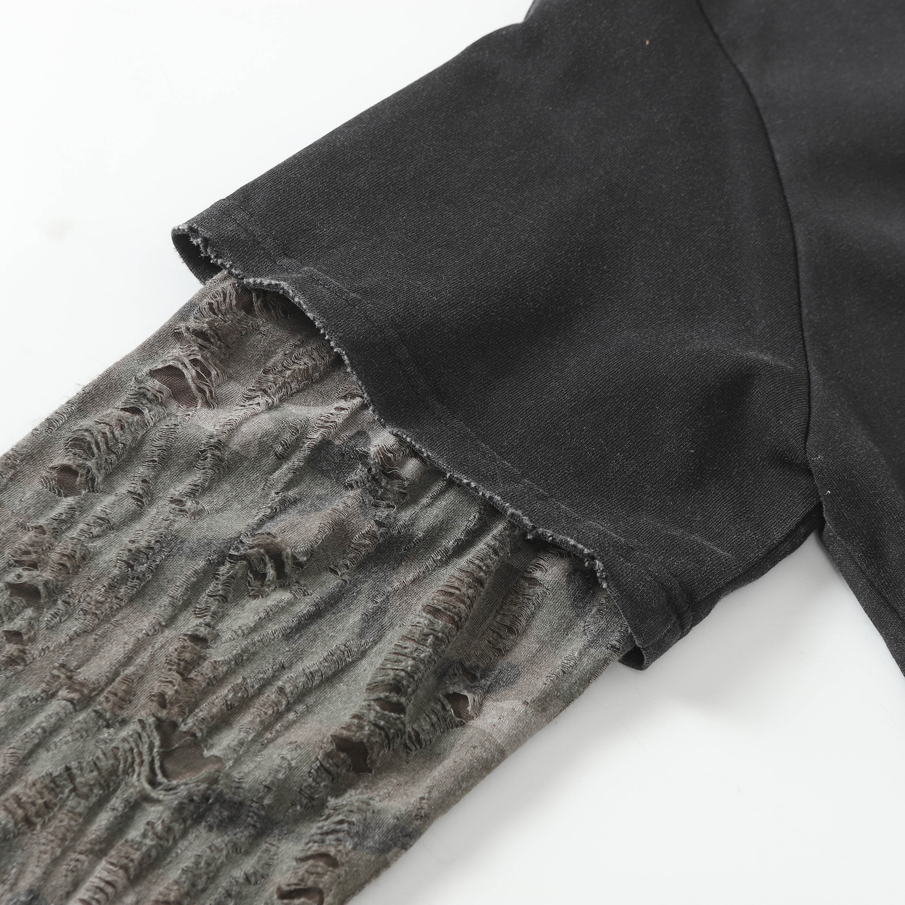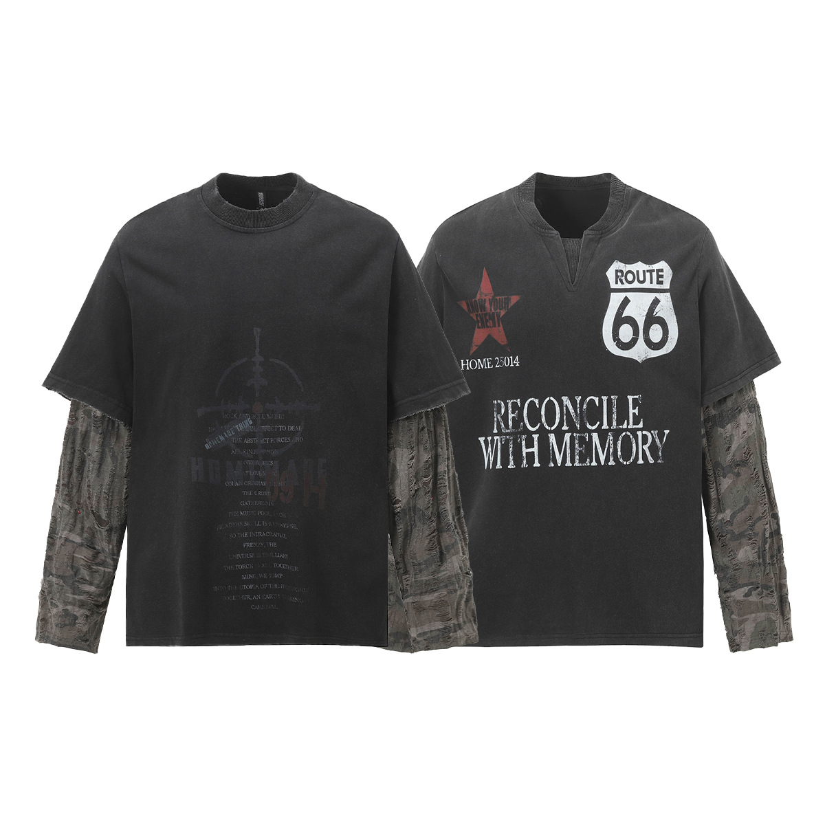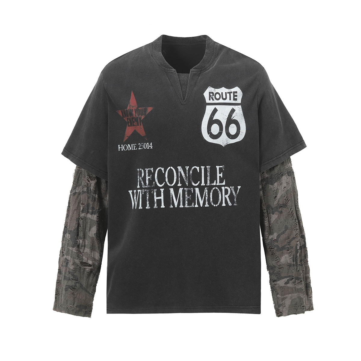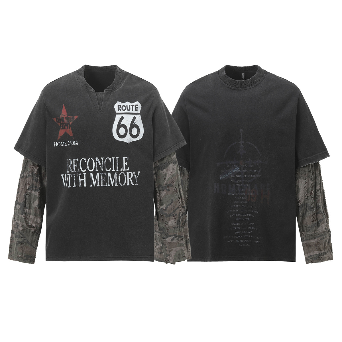 American Street Fashion Brand Fake Two Wash Damaged Erosion Washed Long Sleeve