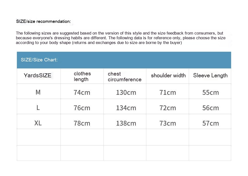 1. Asian sizes are 1 to 2 sizes smaller than European and American people. Choose the larger size if your size between two sizes. Please allow 2-3cm differences due to manual measurement. 2. Please check the size chart carefully before you buy the item, if you don't know how to choose size, please contact our customer service. 3.As you know, the different computers display colors differently, the color of the actual item may vary slightly from the following images.