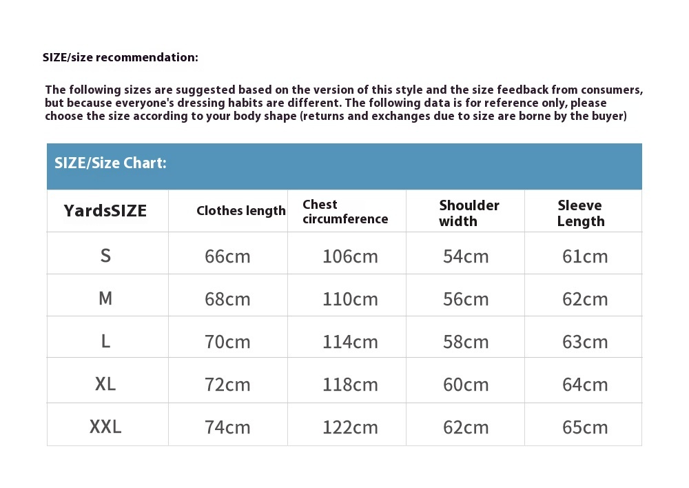 1. Asian sizes are 1 to 2 sizes smaller than European and American people. Choose the larger size if your size between two sizes. Please allow 2-3cm differences due to manual measurement. 2. Please check the size chart carefully before you buy the item, if you don't know how to choose size, please contact our customer service. 3.As you know, the different computers display colors differently, the color of the actual item may vary slightly from the following images.