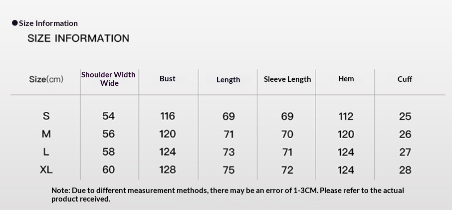 1. Asian sizes are 1 to 2 sizes smaller than European and American people. Choose the larger size if your size between two sizes. Please allow 2-3cm differences due to manual measurement. 2. Please check the size chart carefully before you buy the item, if you don't know how to choose size, please contact our customer service. 3.As you know, the different computers display colors differently, the color of the actual item may vary slightly from the following images.
