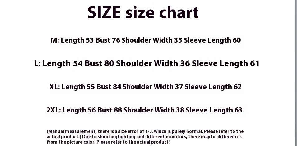 1. Asian sizes are 1 to 2 sizes smaller than European and American people. Choose the larger size if your size between two sizes. Please allow 2-3cm differences due to manual measurement. 2. Please check the size chart carefully before you buy the item, if you don't know how to choose size, please contact our customer service. 3.As you know, the different computers display colors differently, the color of the actual item may vary slightly from the following images.