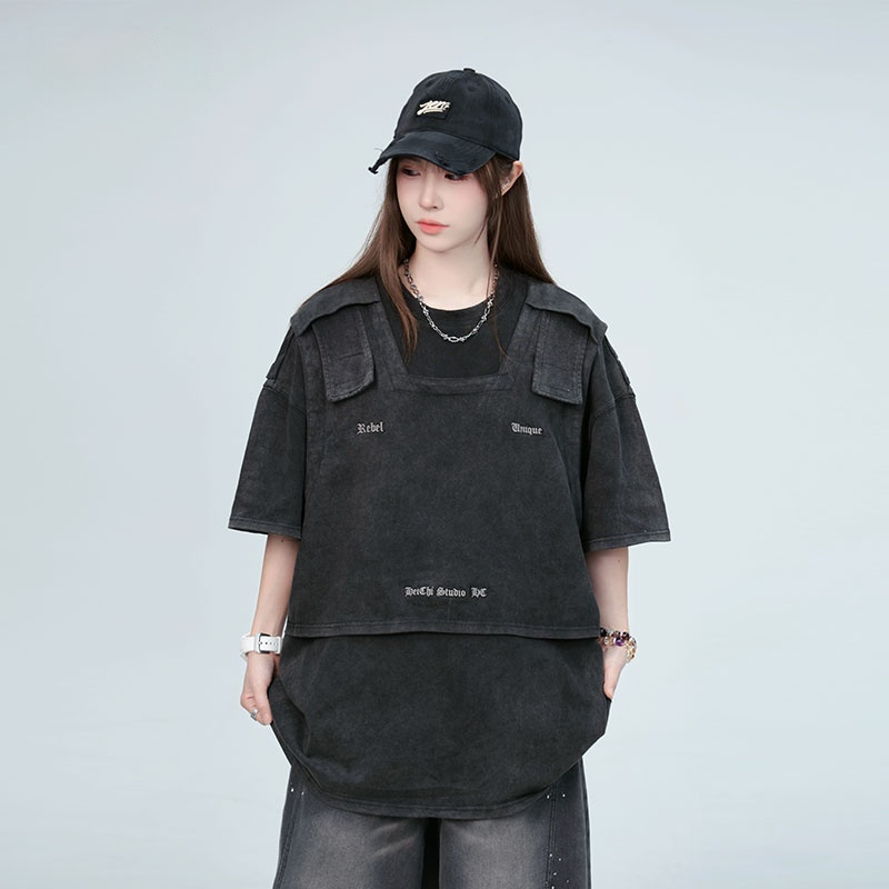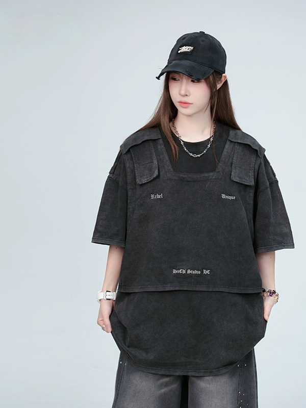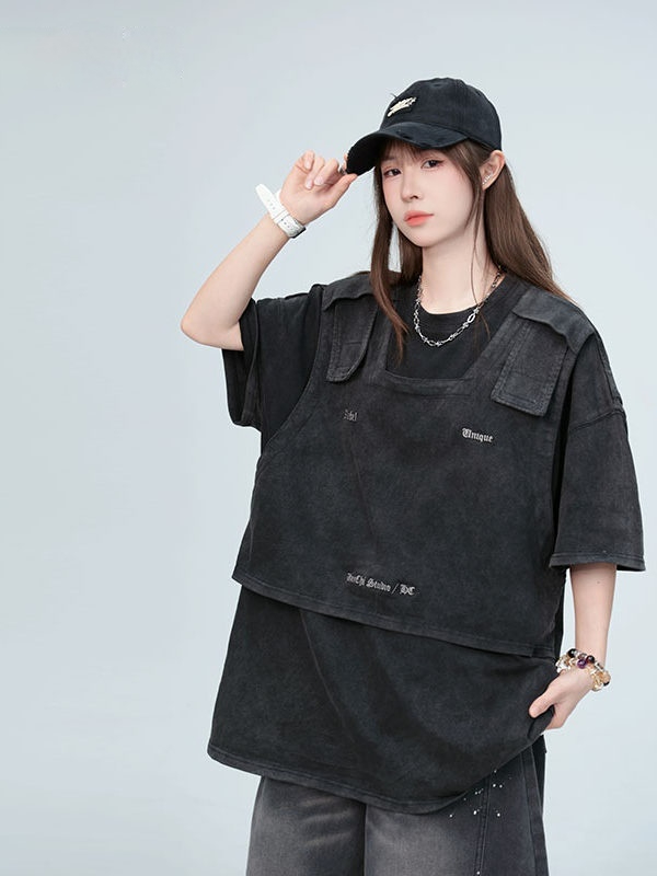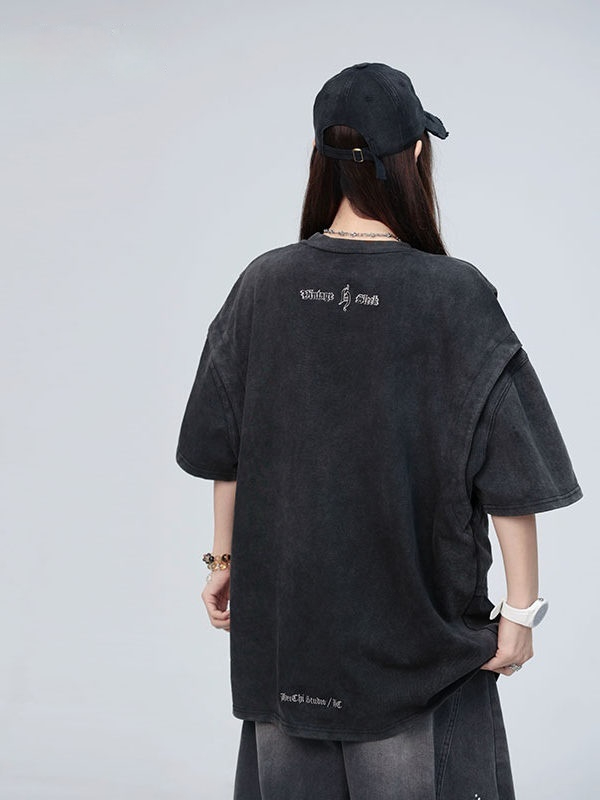 American Washed Distressed Design Fake Two-piece Structure Embroidery Short Sleeve
