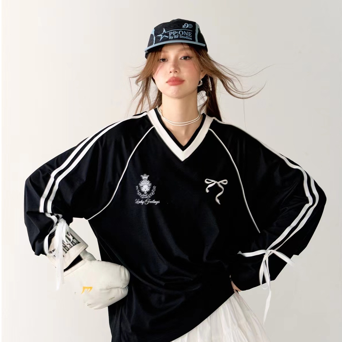 American White V-neck Long Sleeve Women's Early Autumn Design Thin Sweater