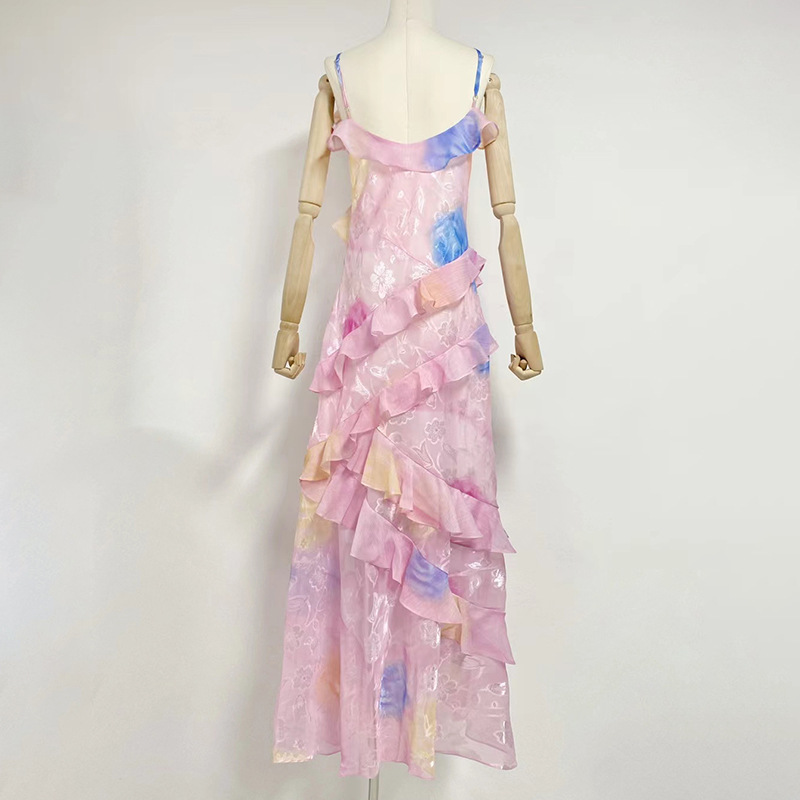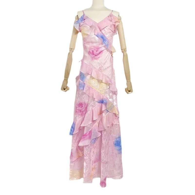 Amoi V-neck Strap Printing Slim Fit Ruffled Dress
