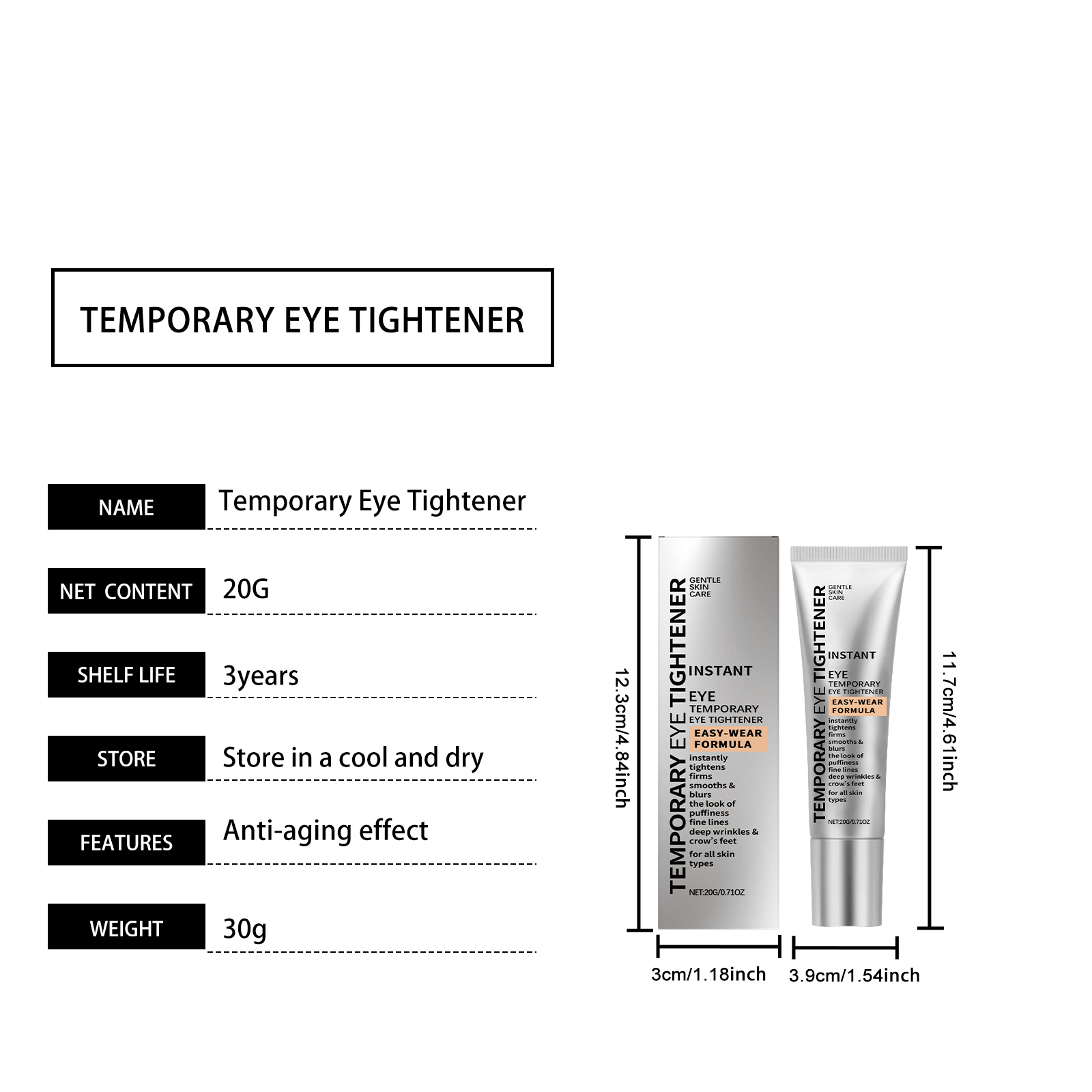 Our moisturizing eye cream is carefully formulated with glycerin, mineral oil and glycerin stearate. Designed specifically for deeply moisturizing the skin around your eyes, reducing dry lines and fine lines, fading crow's feet and enhancing firmness. The usage method is extremely convenient: [Usage Method] Moreover, it can effectively relieve puffiness and dark circles under the eyes, making your eyes look fresh and radiant. It helps enhance the elasticity of the eyes, creating a firmer and younger eye contour. It also helps brighten the dullness around the eyes, increase elasticity, and create young and expressive eyes.