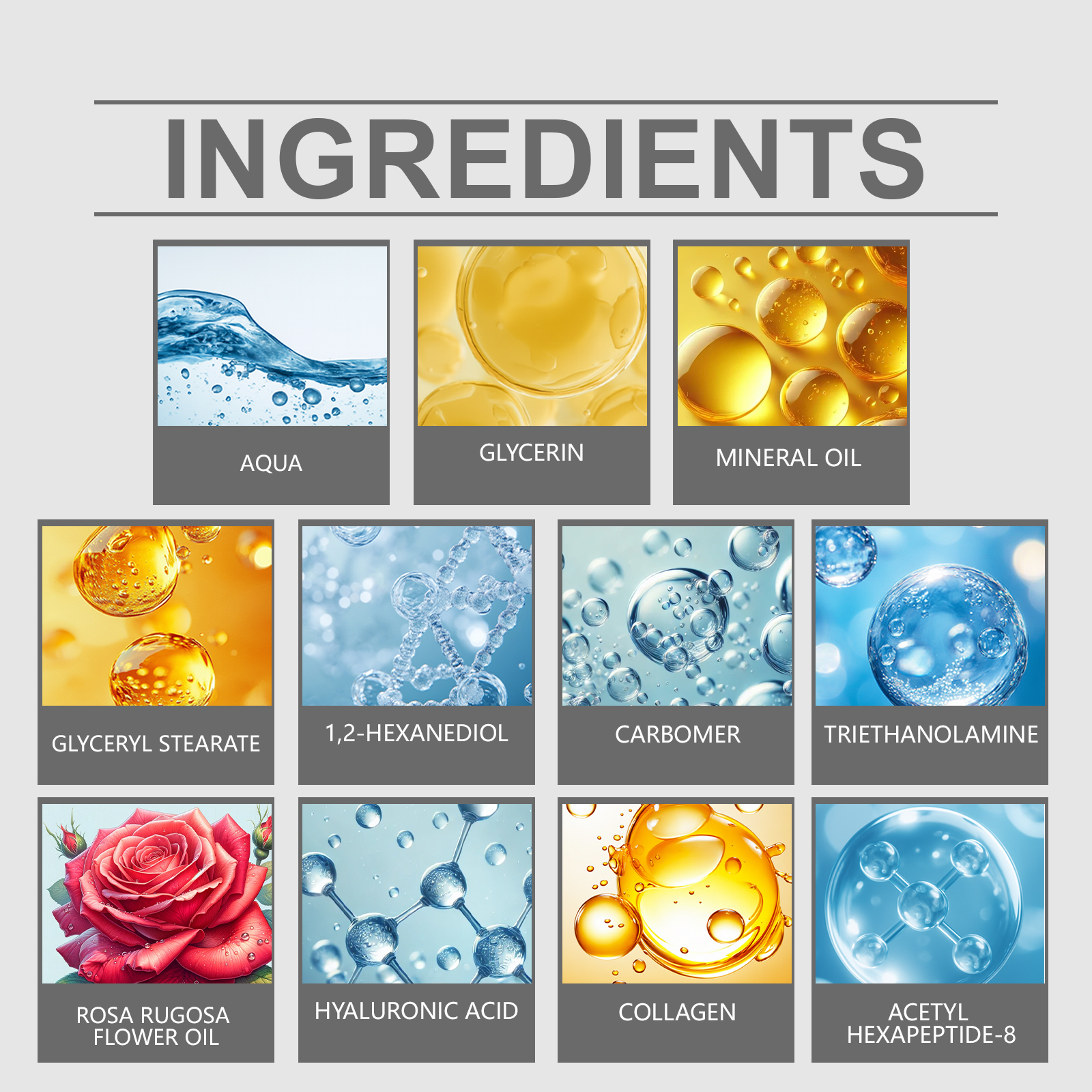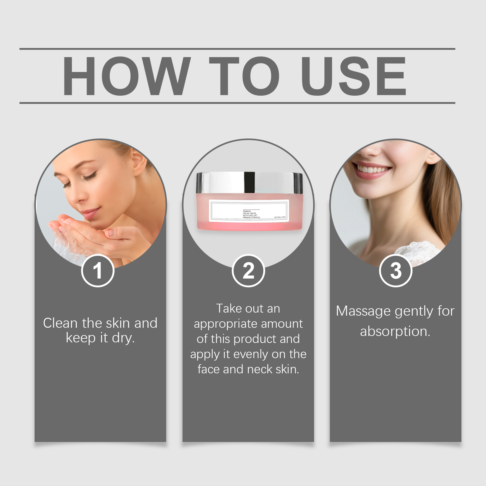 Our moisturizing face and neck cream is carefully formulated with glycerin, mineral oil and glycerin stearate. Specially designed to improve roughness and dullness, deeply hydrate and lock in moisture, and protect the skin's moisture. The usage method is extremely convenient: 1. Clean the skin and keep it dry. 2. Take an appropriate amount of this product and apply it evenly to the skin on the face and neck. 3. Gently massage for absorption. And it can help the skin become firm, elastic, delicate and tender, lift the facial contour and show an upward posture.