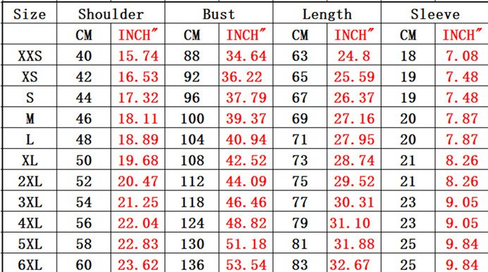 Size: XXS, XS, S, M, L, XL, XXL, 3XL, 4XL, 5XL, 6XL