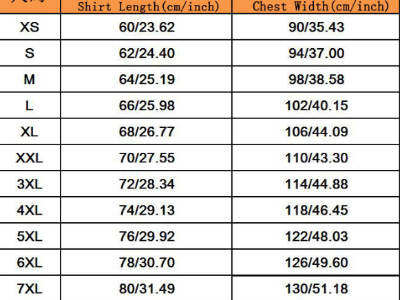 Size: XS, S, M, L, XL, XXL, 3XL, 4XL, 5XL, 6XL, 7XL