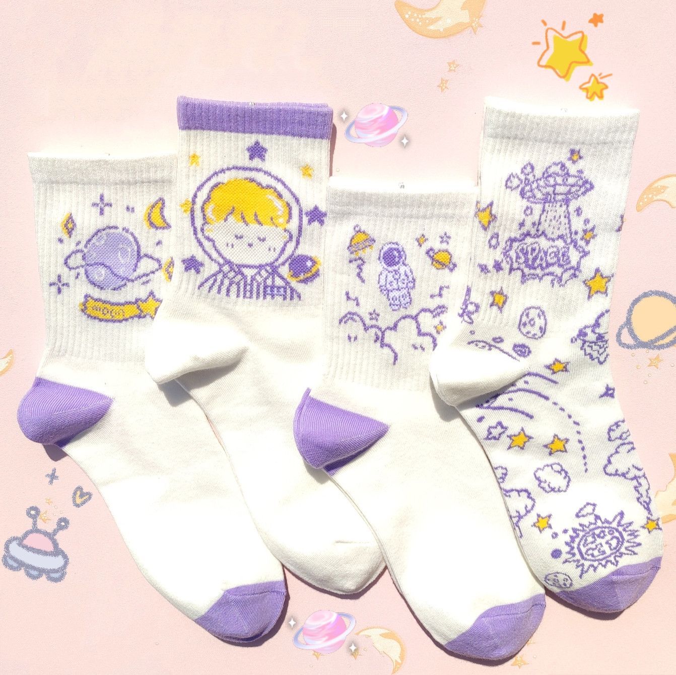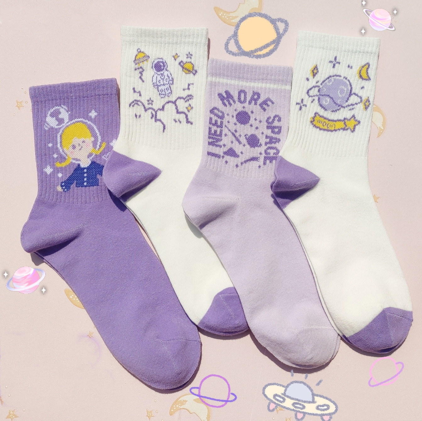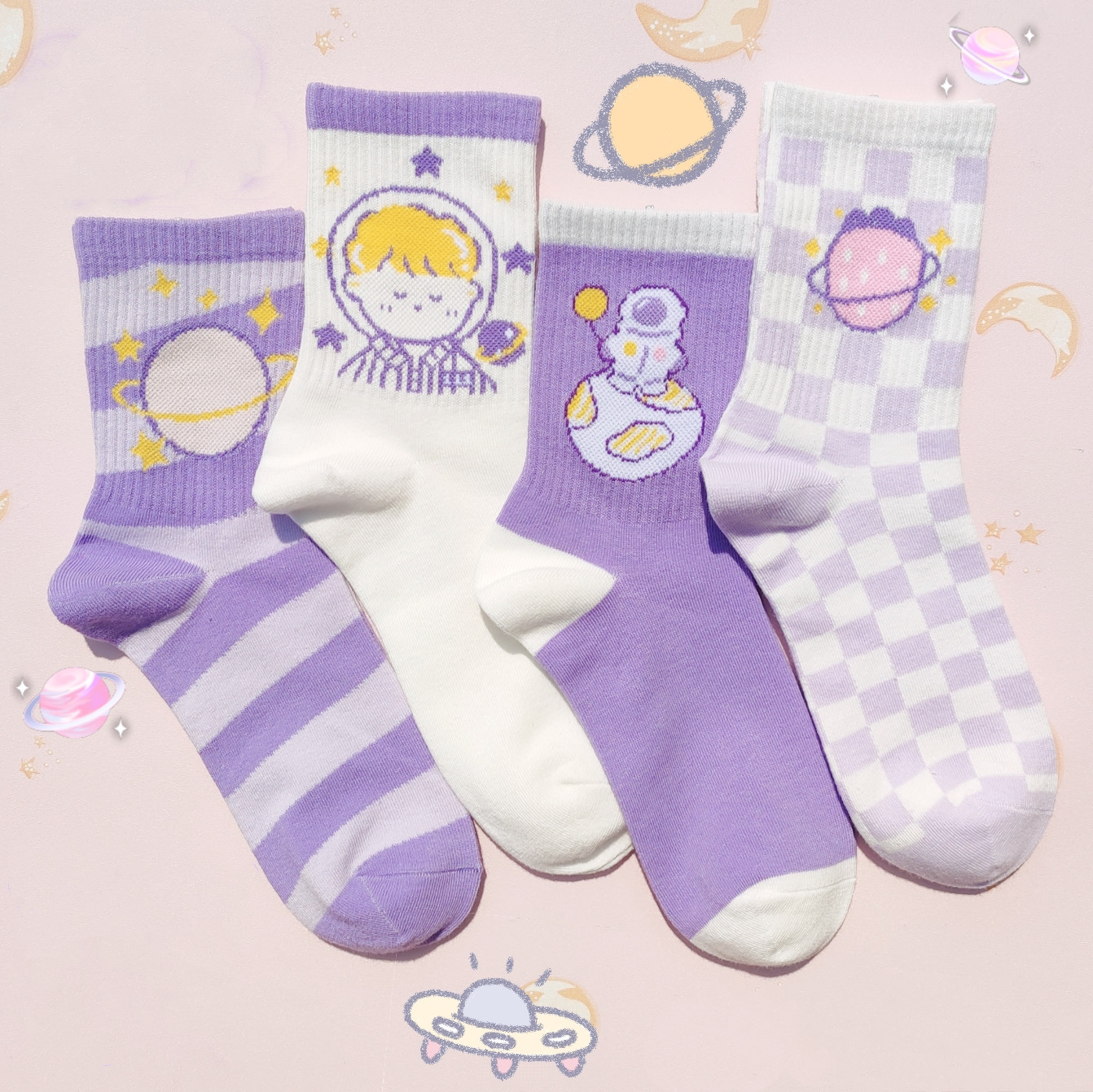 Color classification: A: 4 pairs of free collocation, B: spaceship white + planet swirl + space boy, C: space girl + spaceman + space English, D: space English + spaceship purple + little monster, E: moon + space boy + spaceman, F: planet swirl + space boy + astronaut
