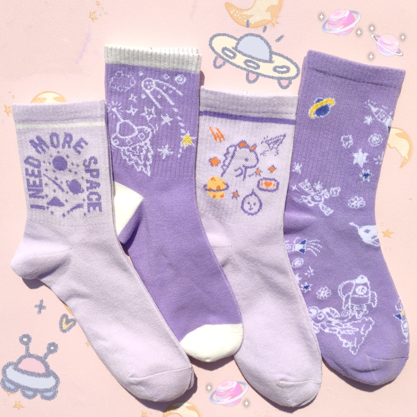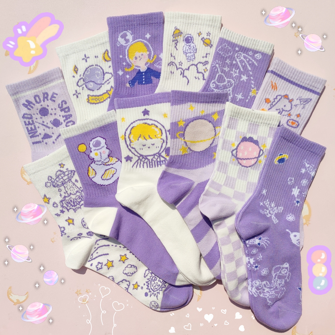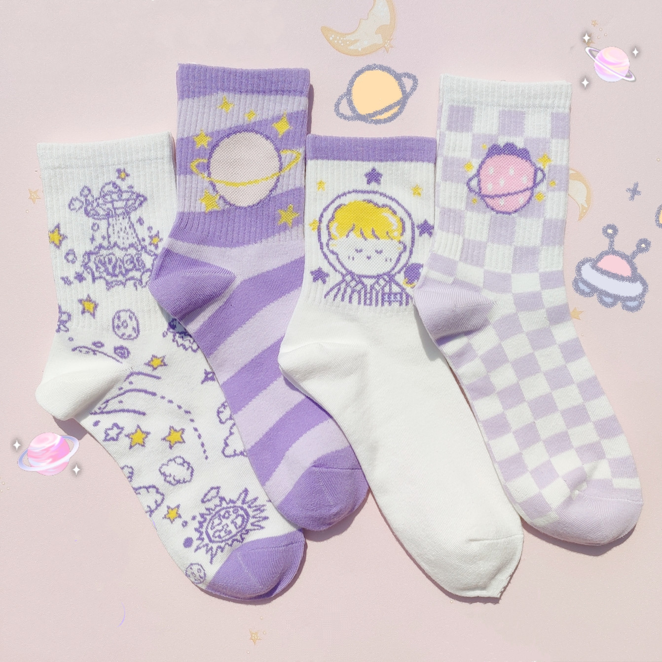 Color classification: A: 4 pairs of free collocation, B: spaceship white + planet swirl + space boy, C: space girl + spaceman + space English, D: space English + spaceship purple + little monster, E: moon + space boy + spaceman, F: planet swirl + space boy + astronaut