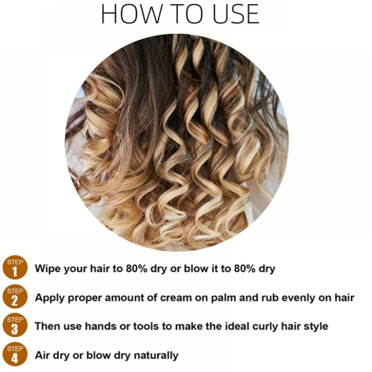 Usage:Take an appropriate amount and apply it to damp hair, focusing on the middle to the ends. Gently knead or twist curly hair to enhance clarity. Let the hair air dry naturally or use a diffuser to increase hair volume. Form according to demand.