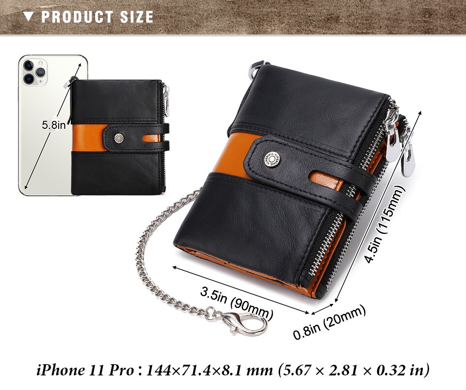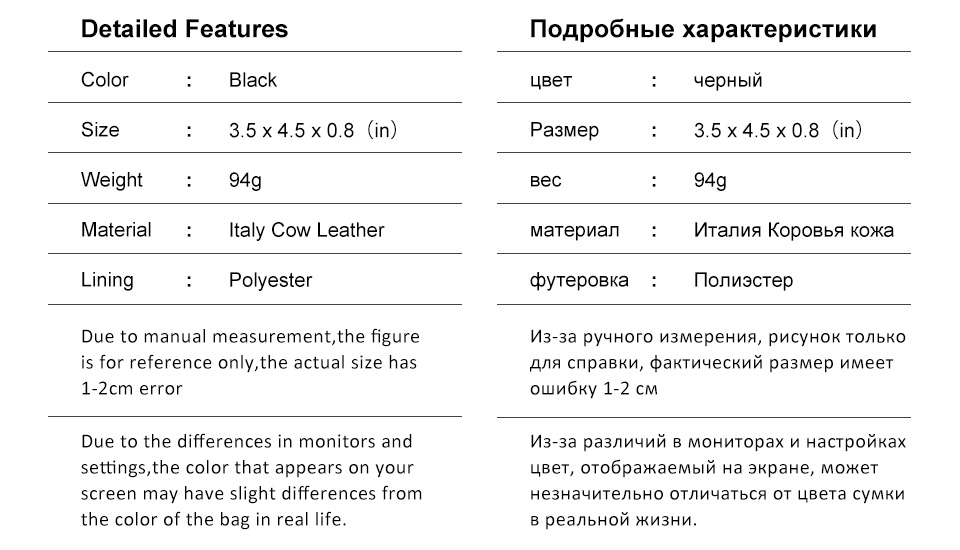 Detailed FeaturesColors: blackSize: 125 x20x 95 (mm)Material : Italy Cow LeatherLining : PolyesterClosure : Hasp