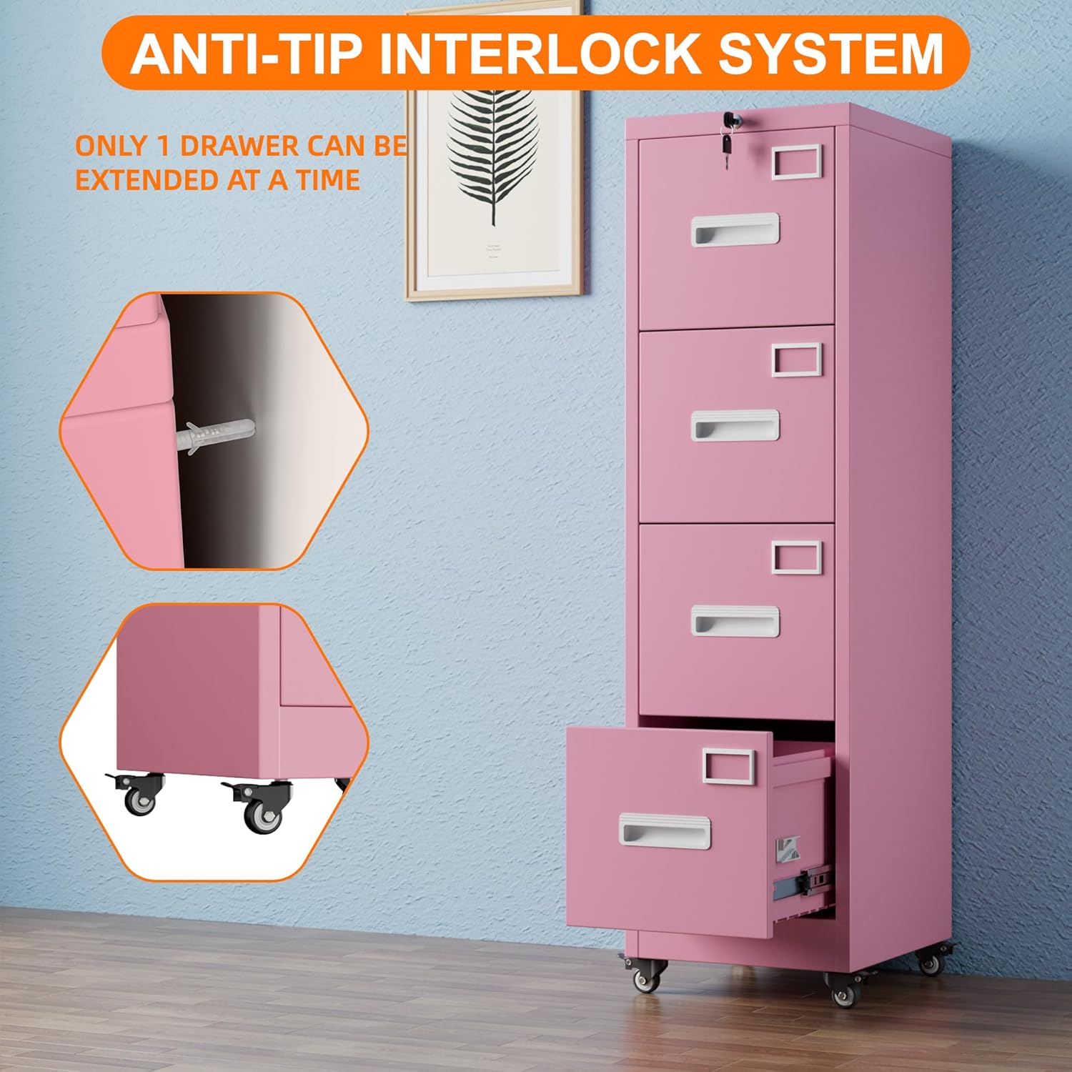 【Moveable on 4 wheels】Metal File Cabinet with wheels has 4 small lockable wheels, you can move them around as needed and the casters and wheels work great on all the different surfaces, besides the wheels can be locked and you can fix the cabinet where you want to place