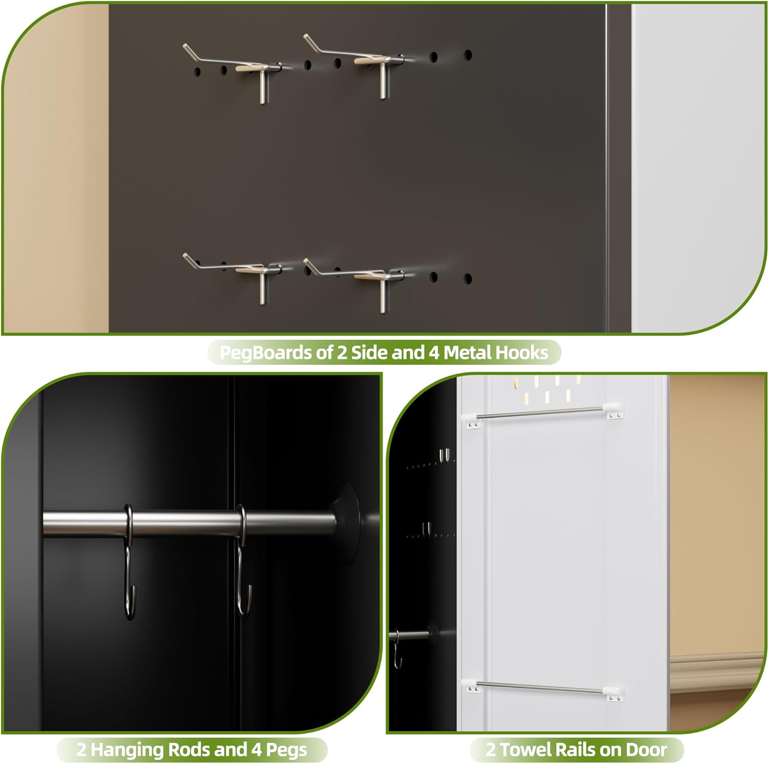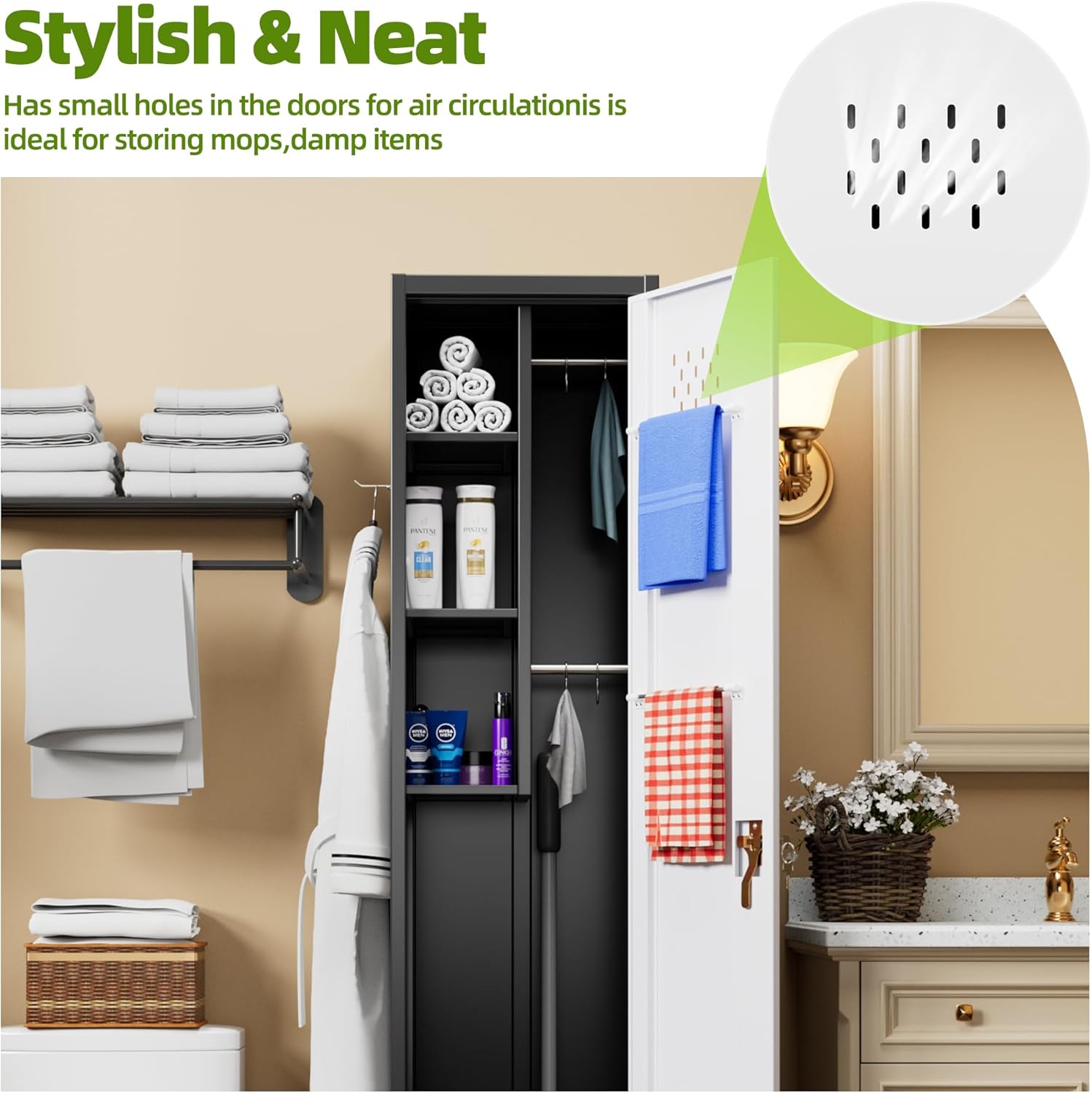 Multi-functional storage: Cleaning cabinet features a double-sided perforated board design with 4 long hooks and 4 small hooks. Different storage Spaces allow for flexible hanging of various cleaning tools such as brooms, mops, spray guns, extension rods, and rags, saying goodbye to clutter. There are two practical towel racks on the inner door panel, which are perfect for storing rags, cleaning gloves or small items
