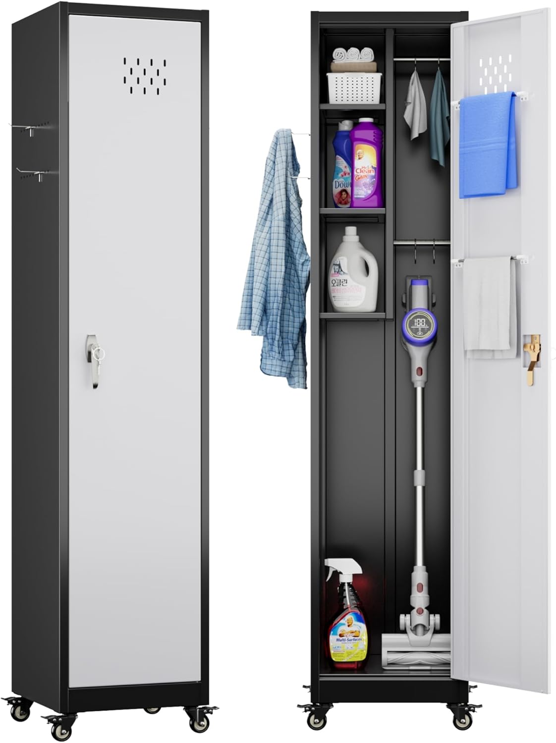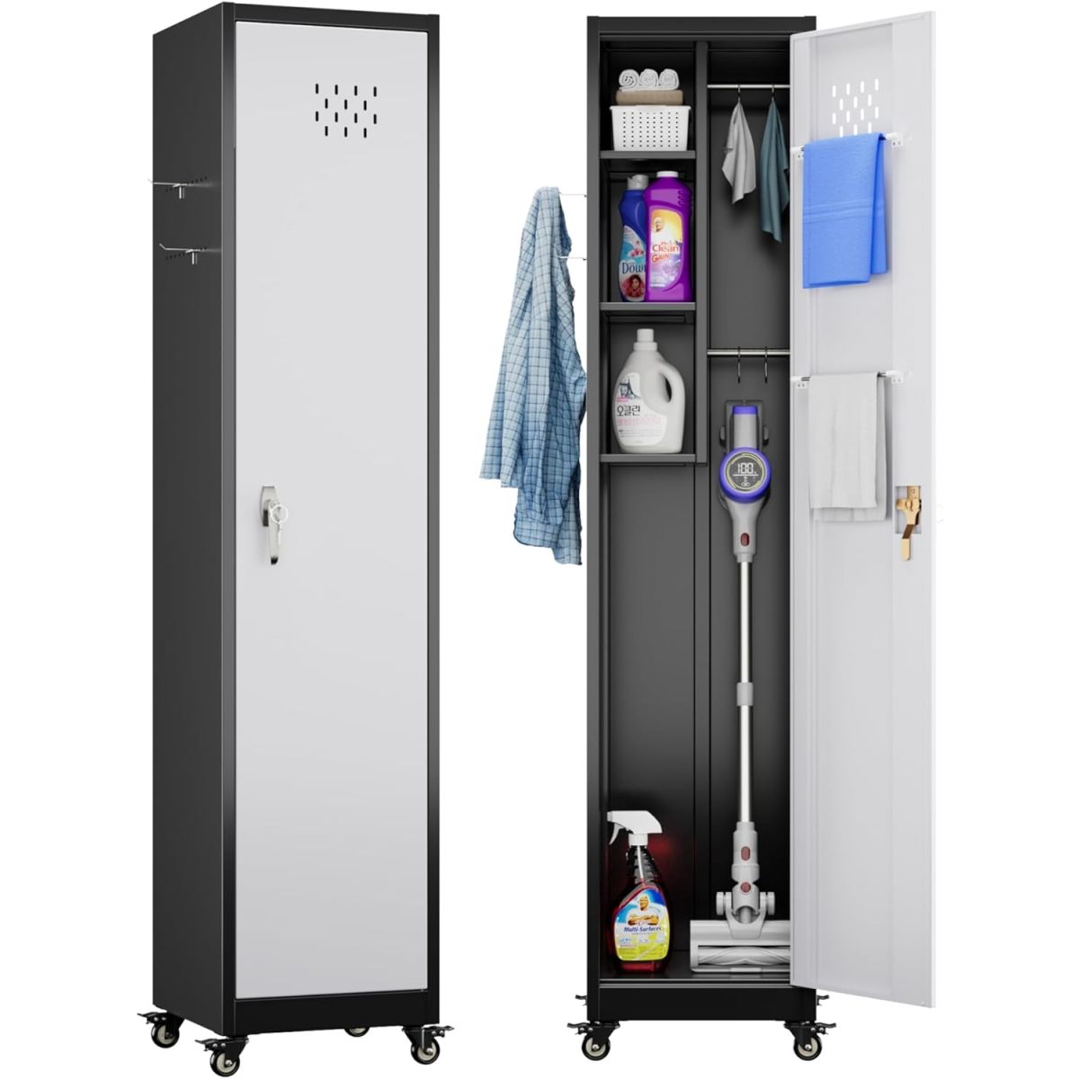 Aobabo H Lockable Storage Cabinet With Wheels, Metal Cleaning Tool Cabinet With Hooks, Cleaning Supplies For Broom Rack Shelf For Broom Mops Garage Storage, Black White, Assembly Required