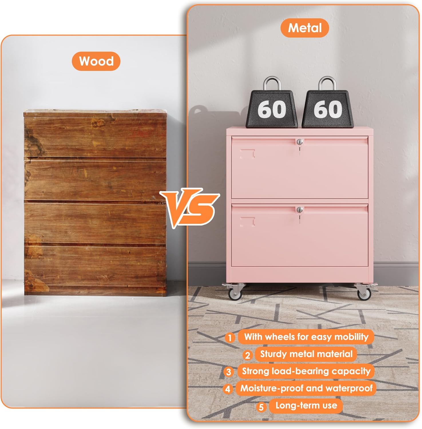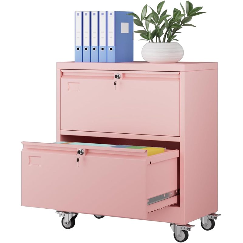 Aobabo Metal 2 Drawer Lateral File Mobile Cabinet With 2 Lock, File Cabinet With Wheels And Adjustable File Bars For Office, Home, For Letter Legal Size, Pink, Assembly Required
