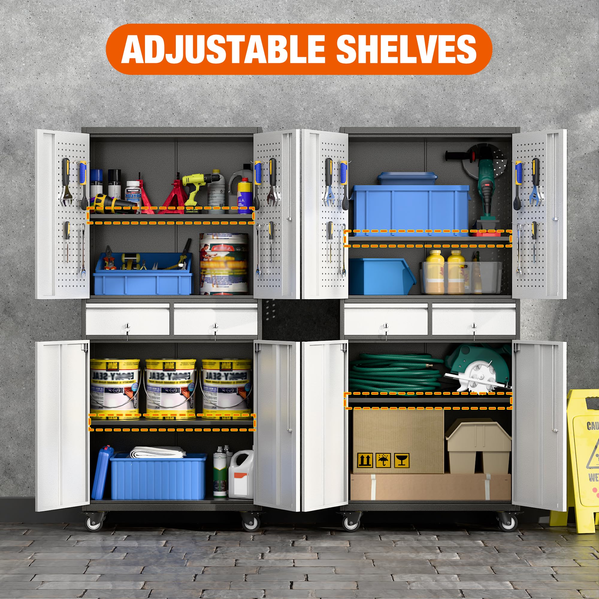 Adjustable Shelves: The locking cabinet has 2 adjustable shelves. The shelves can be adjusted up and down to the desired position for your household items, tools, and other items. this tall metal cabinet also has an interior design that adds extra space to any room