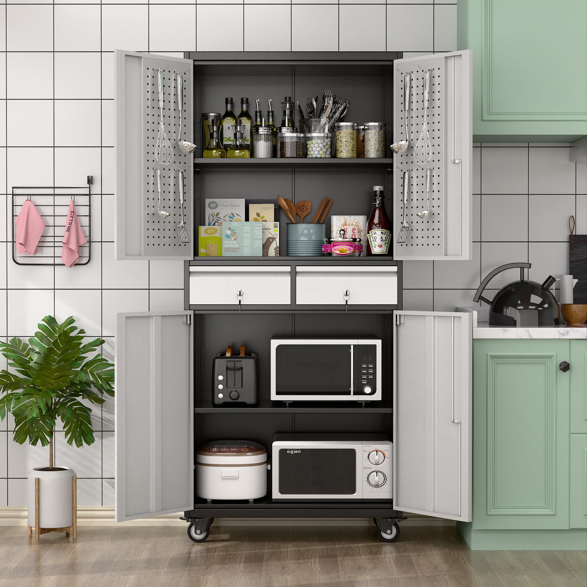 Aobabo Metal Storage Cabinet With Locking Doors And Pegboards, Steel Rolling Tool Storage Cabinet With 2 Drawer And 2 Adjustable Shelves For Garage, Kitchen, Office, Assembly Required, Black Grey