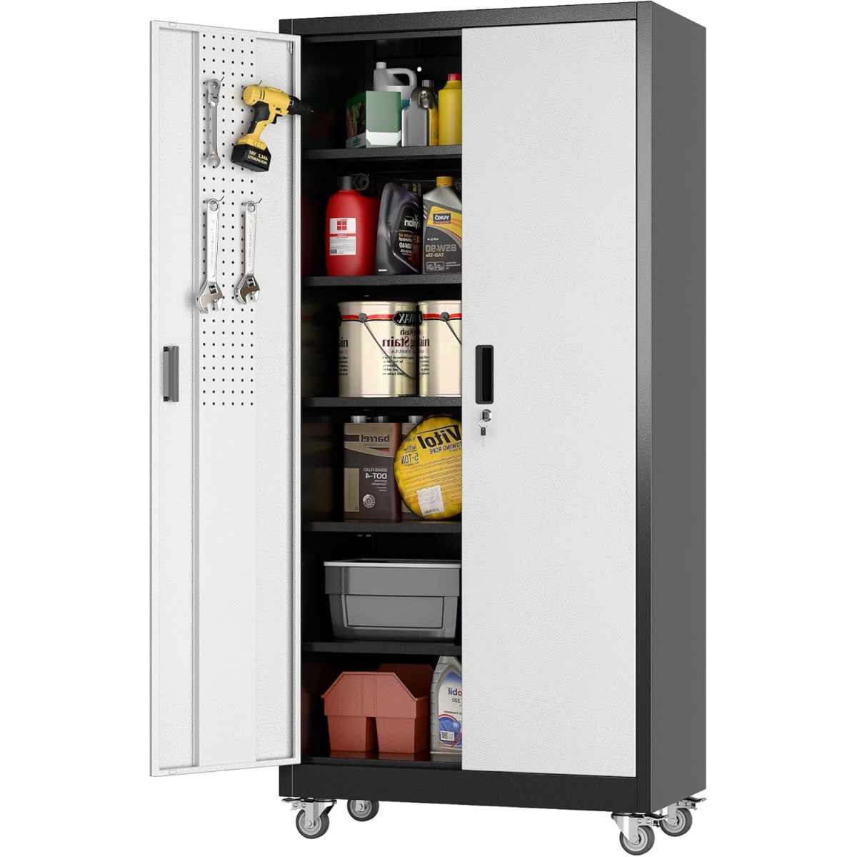 Aobabo Upgrade Metal Garage Storage Cabinet With Wheels And Pegboards, 5 Adjustable Shelves Steel Storage Cabinets For Home,Warehouse,Garage,Assembly Required,Black And Sliver
