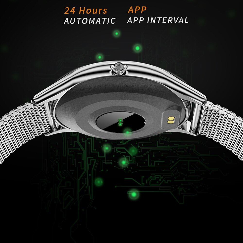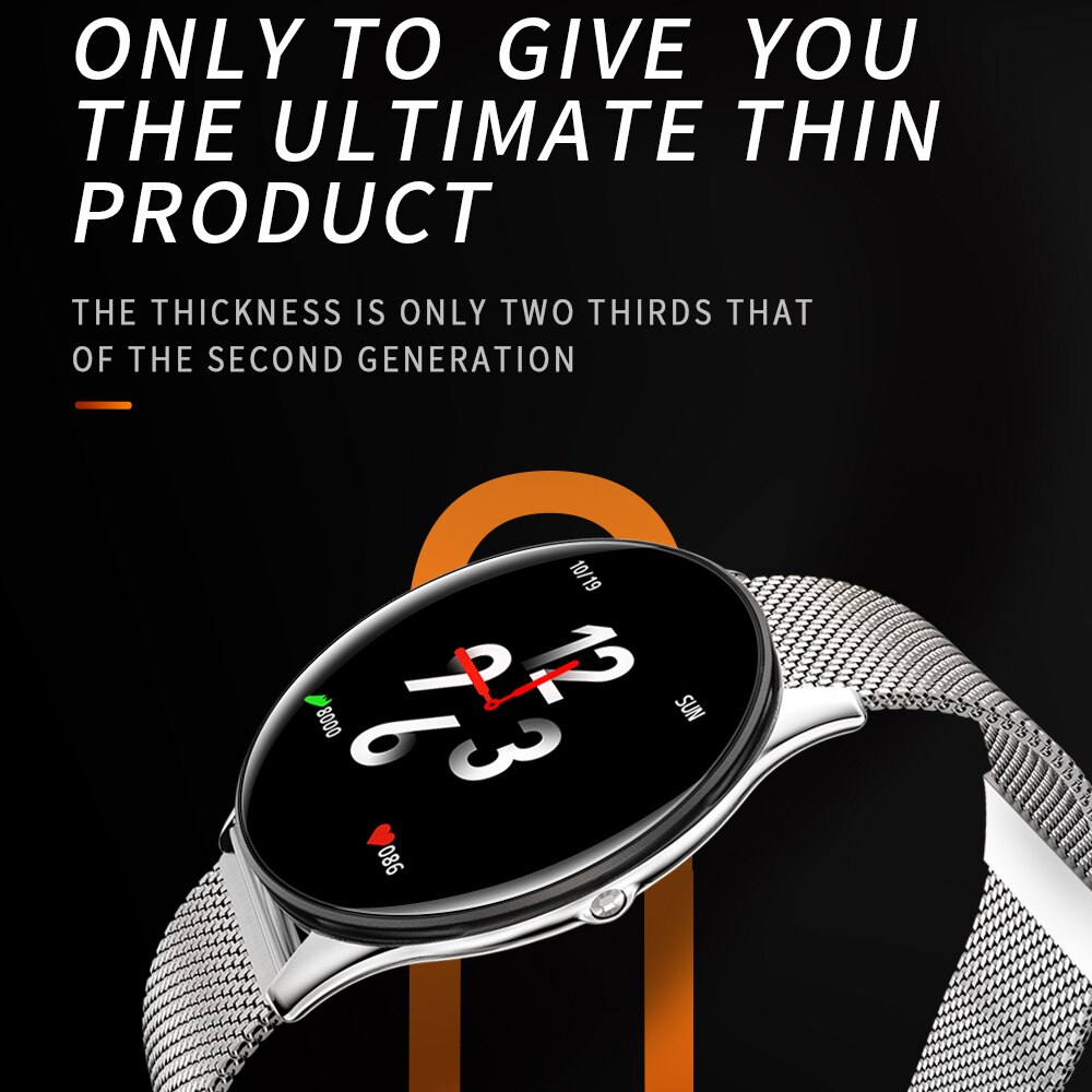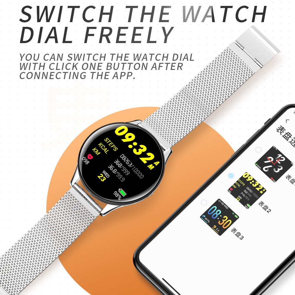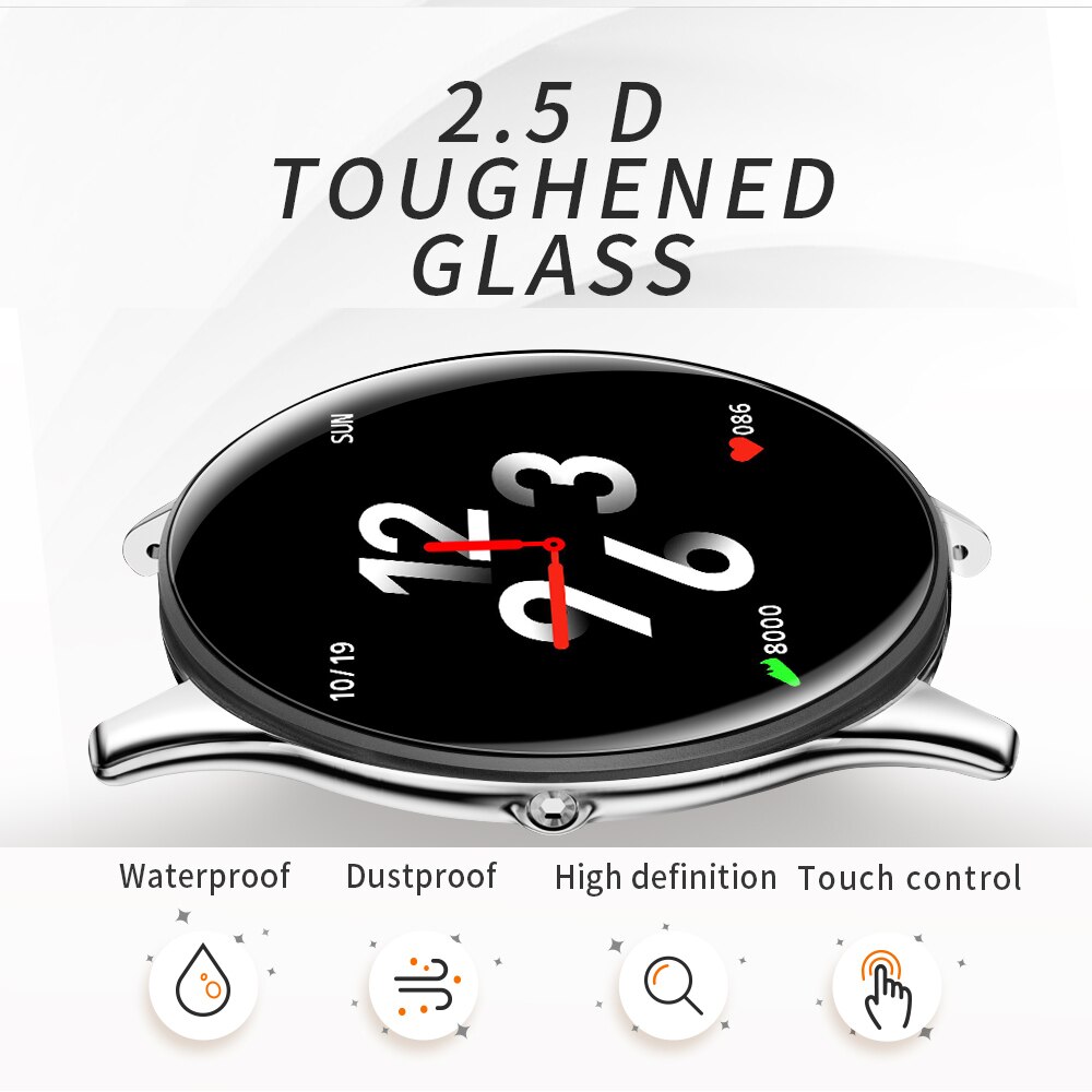 High-definition LCD 1.3 inch 2.5D touch screen with resolution of 240x240 pixels. Made of tempered glass watch dial surface and steel watch strap, high quality and durable.