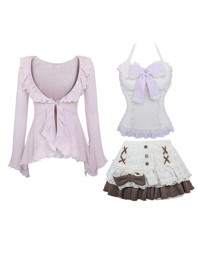 Color classification: apricot knitted sling, purple knitted cardigan, knitted stitching cake dress, purple knitted short sleeve cardigan