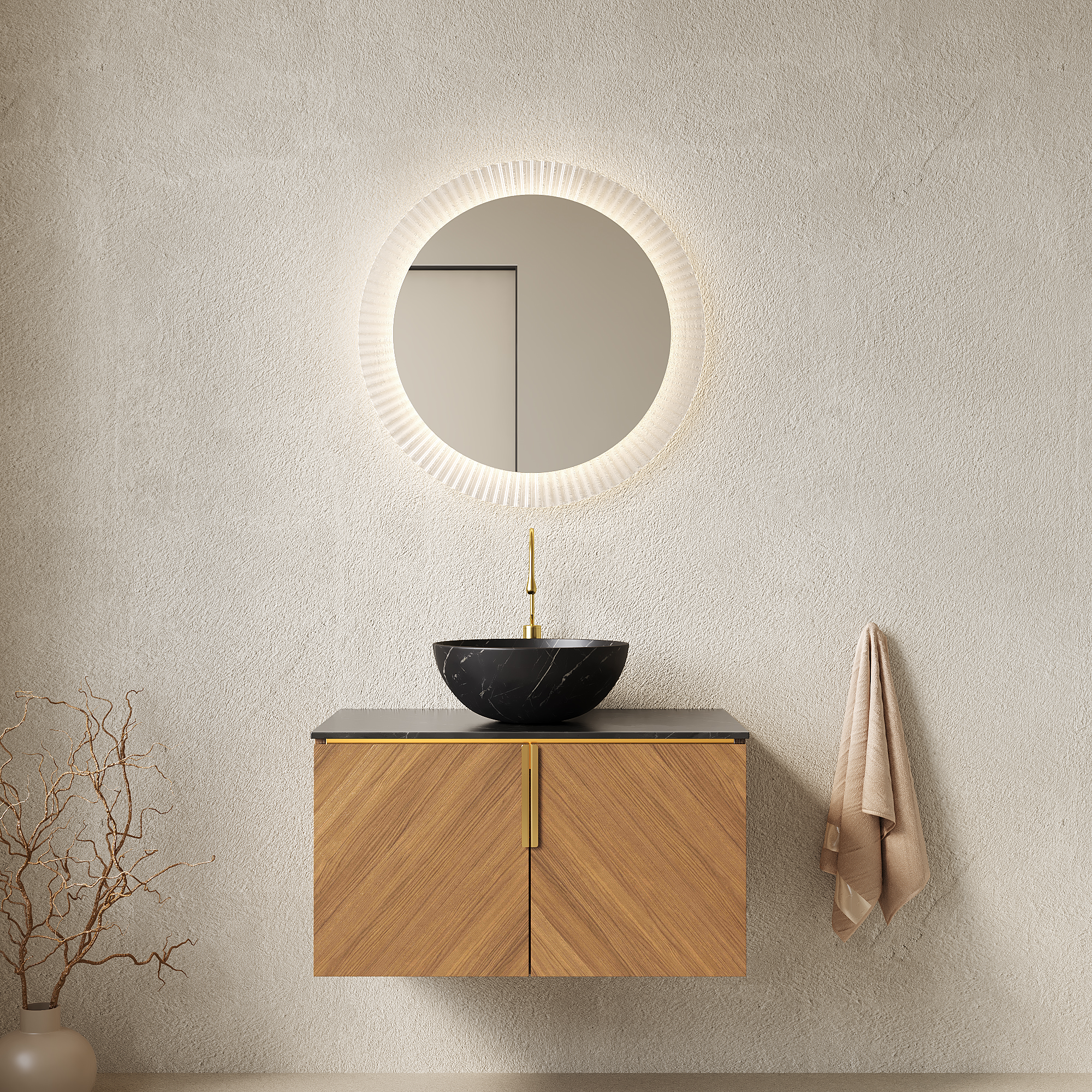 The cabinet is finished with a brown oak grain, and the door panels of the cabinet feature a unique and distinctive design of symmetrical diagonal textures. The brushed gold handles, crafted from high - quality metal, shine with a charming luster. The cabinet is made of high-quality plywood, it has excellent water and moisture resistance to ensure that not easy to be deformed or moldy even in a humid bathroom environment. *Please noted that the panel may have different color and grain pattern under the different light.