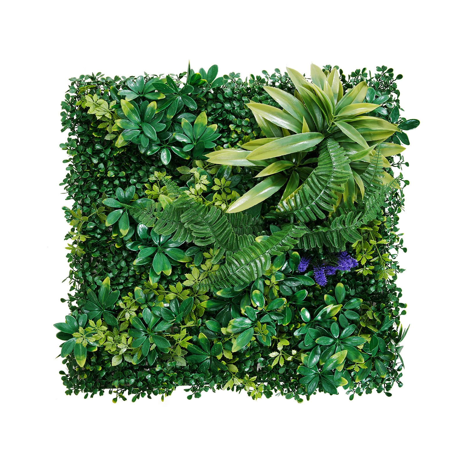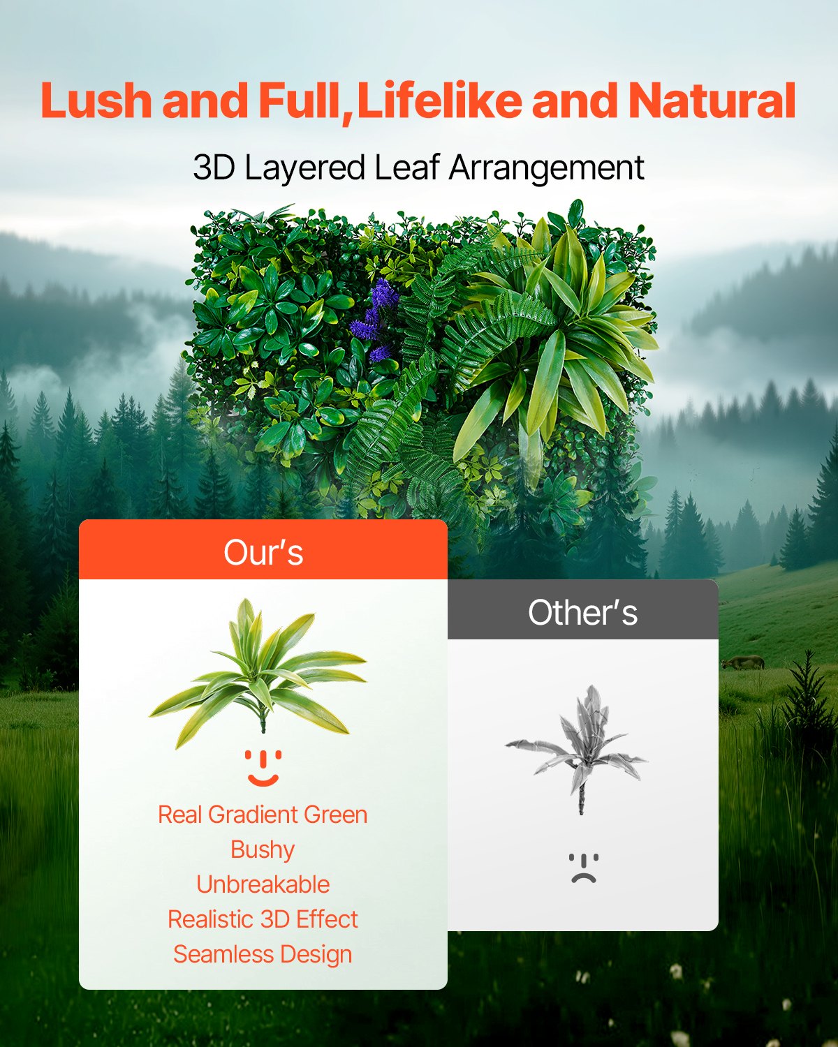 Features & Details 3D Textured Leaves: Crafted from PE material, the 3D combination of leaves offers a more realistic look. The natural gradient of green hues, combined with a variety of leaf types, enhances the plant wall's overall richness and multi-layered design, making it lifelike and visually appealing Enhanced Privacy Coverage: Featuring a four-layer backing and leaf heights ranging from 1.8 to 3.54 inches, the dense, layered design ensures no gaps, creating a natural and seamless look. Once installed, it provides excellent coverage for enhanced privacy Quick Installation: The interlocking connector system allows for fast and secure assembly of your plant wall. Additionally, we include 100 complimentary zip ties for you to easily attach the panels to fences or other structures. The plant wall is both flexible and easy to cut, making it perfect for DIY designs to fit your specific needs Versatile for Multiple Scenarios: Suitable for both indoor and outdoor spaces, this plant wall can be used to decorate your balcony, patio, garden, or interior walls. It’s also a perfect choice for seasonal celebrations, allowing you to enhance holiday backdrops or event spaces 22.22 sq. ft. Coverage Area: Each faux greenery wall set includes 8 panels, covering up to 22.22 sq. ft. Before purchasing, you can measure your space and determine the appropriate quantity needed to achieve the desired coverage