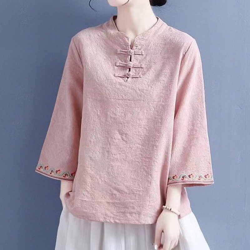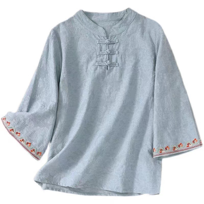 Artistic Cotton Linen Jacquard Embroidered Bell Sleeve Shirt