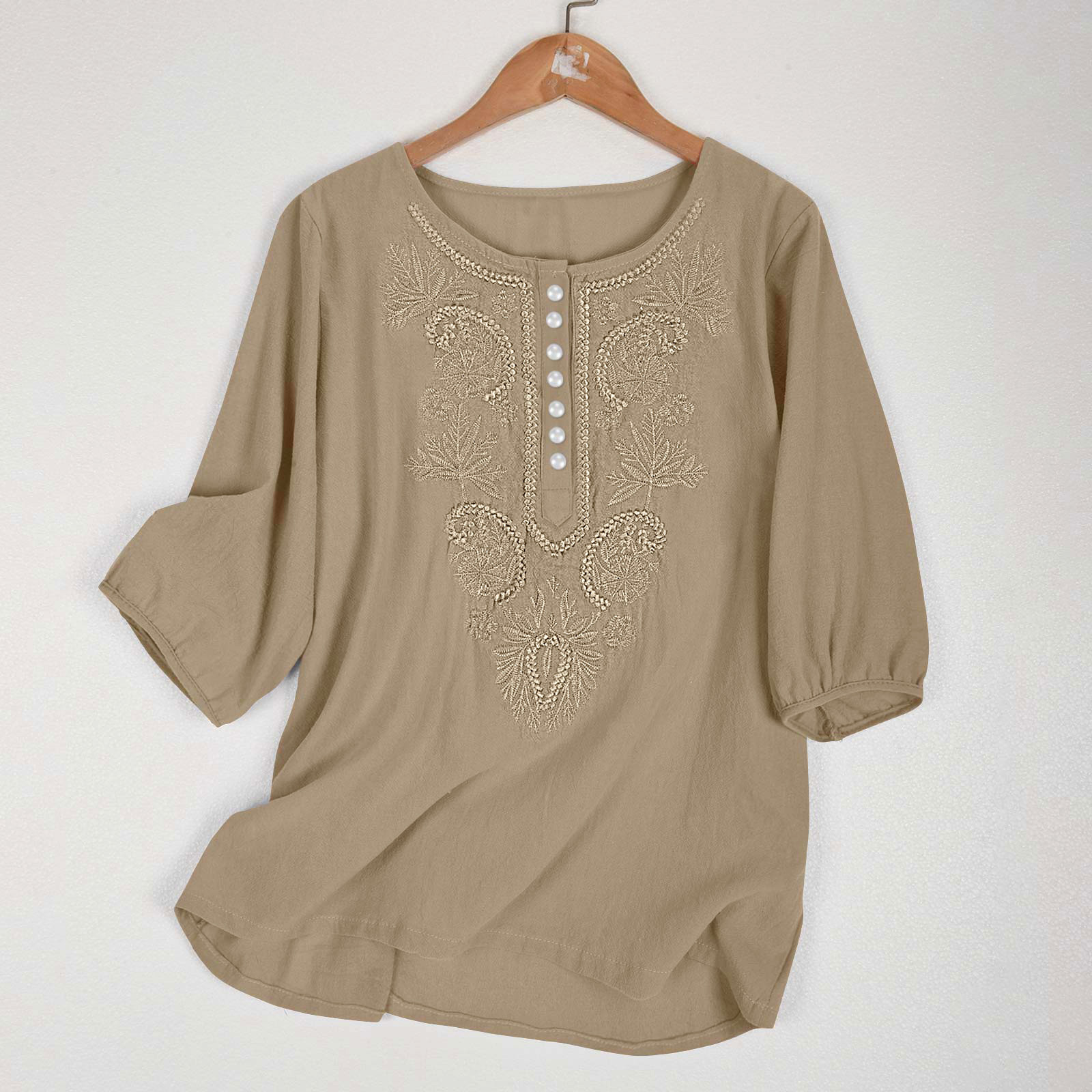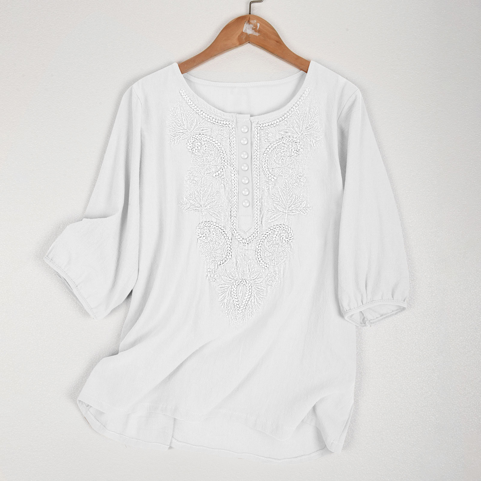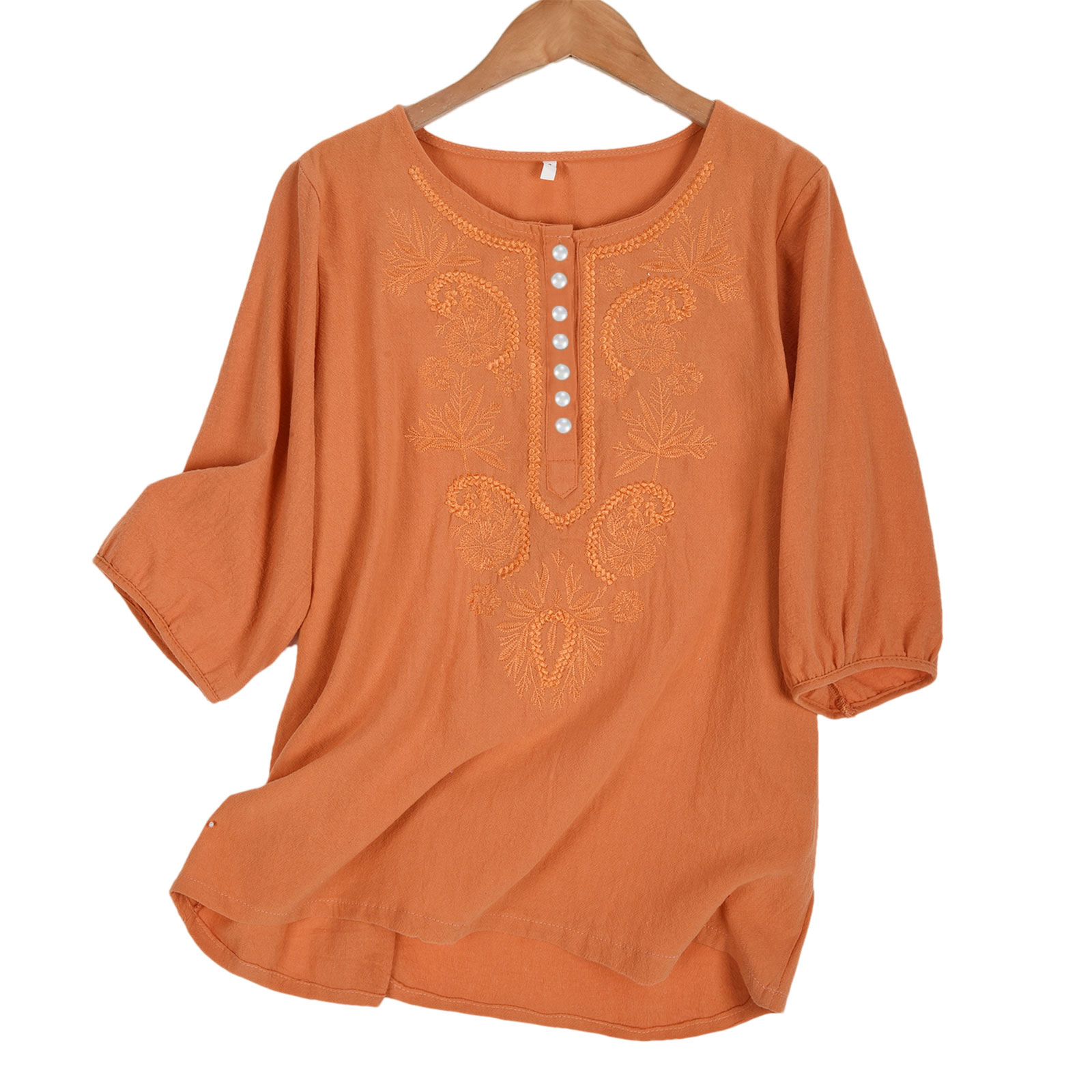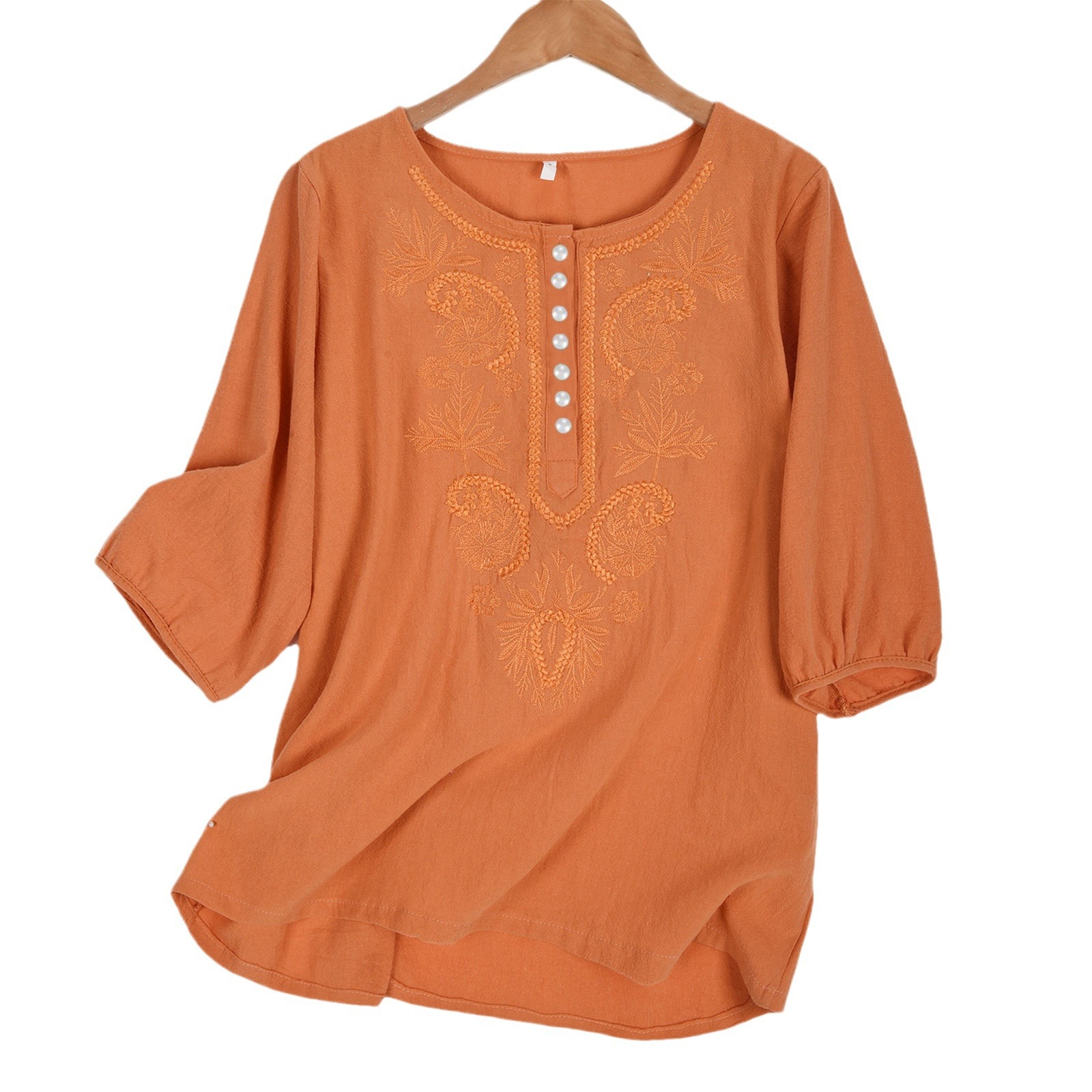 Artistic Retro Loose Design Embroidered Crew Neck Thin Cotton And Linen Women's Top