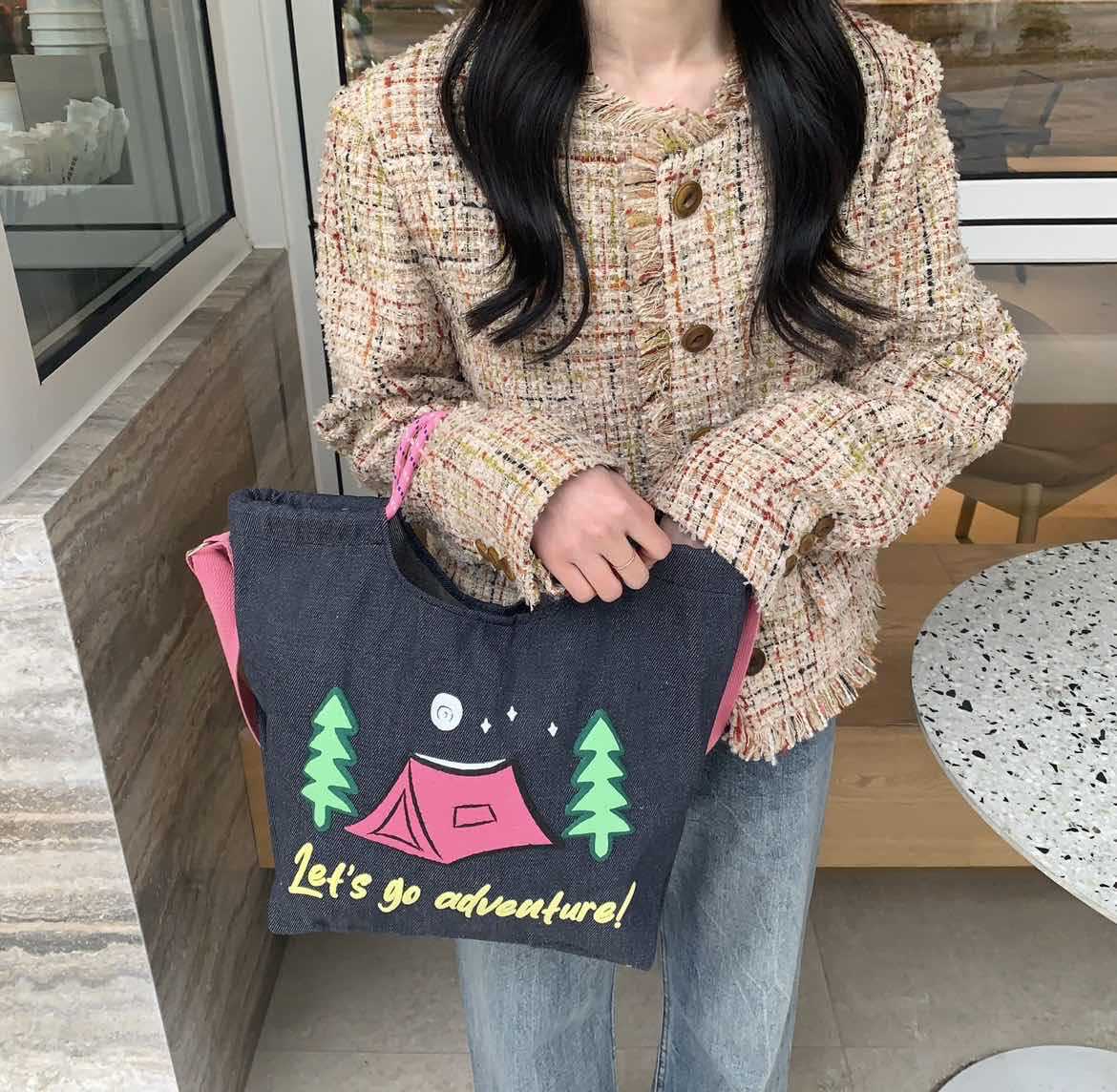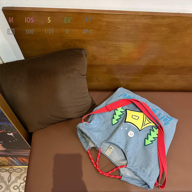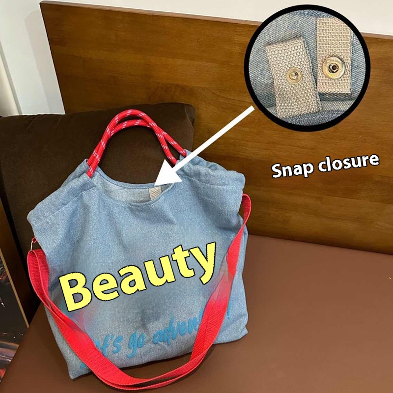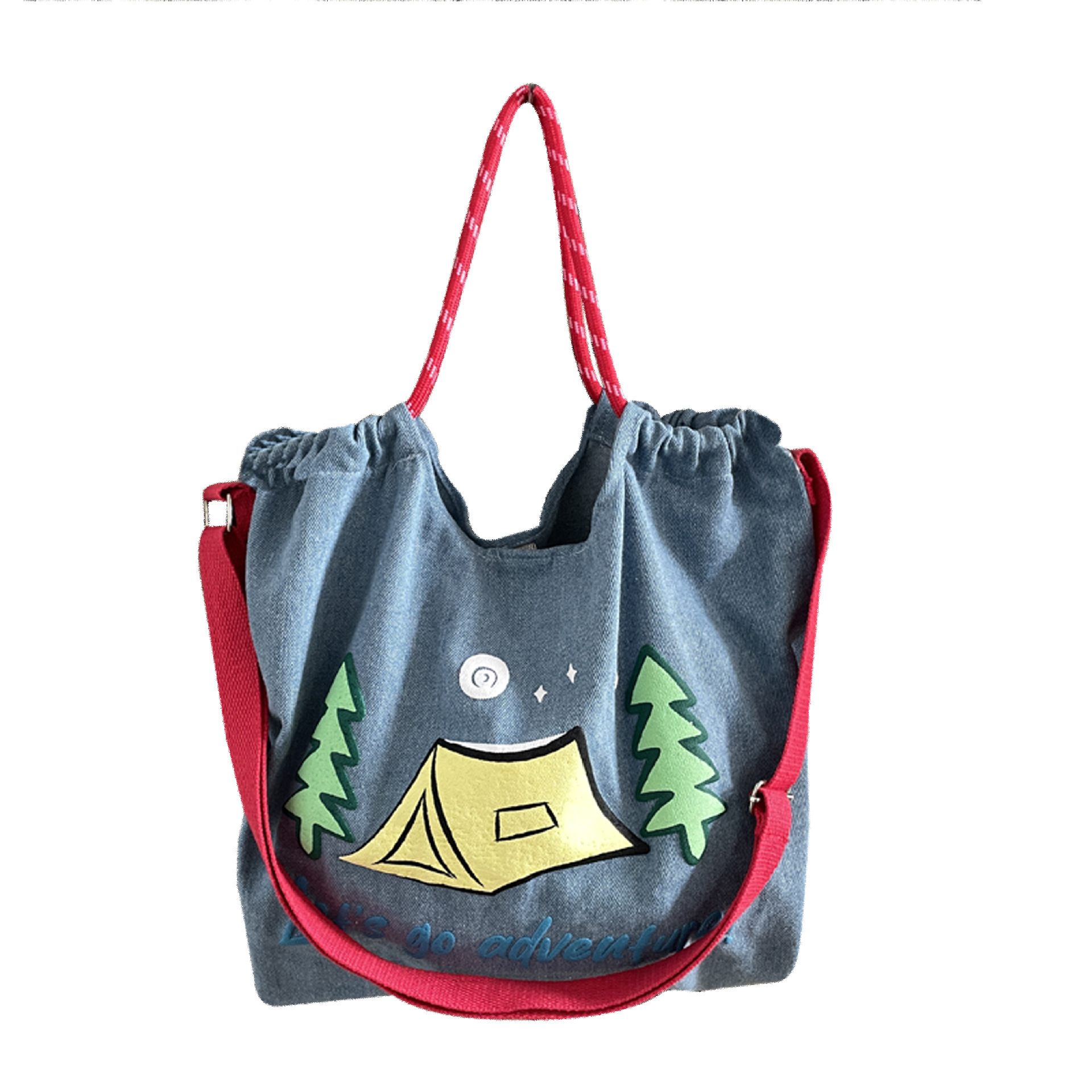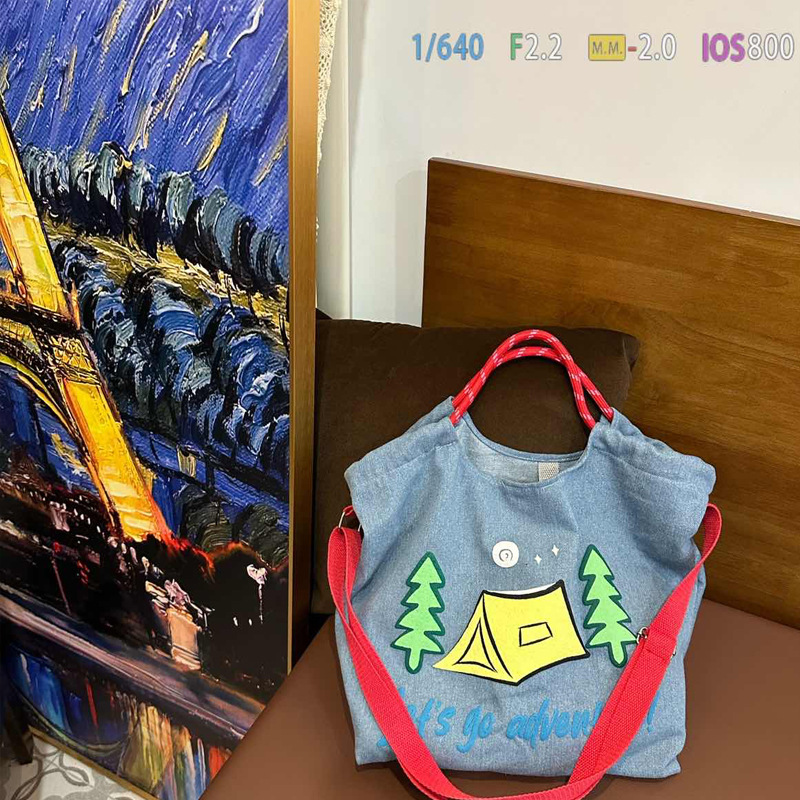 Color: puff printed light blue denim cradle bag, puff printed dark blue denim cradle bag