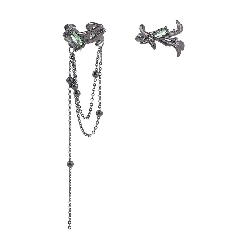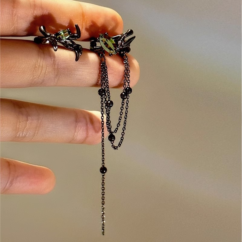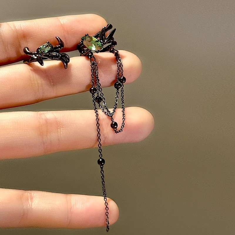 Asymmetric Cool Gun Black Green Diamond Tassel Earrings