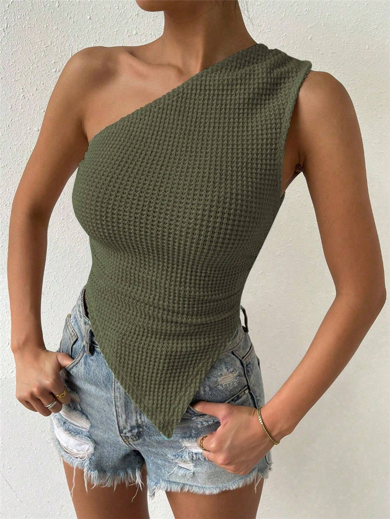 Asymmetrical Hem Knitted Sleeveless Top With One-Shoulder Design