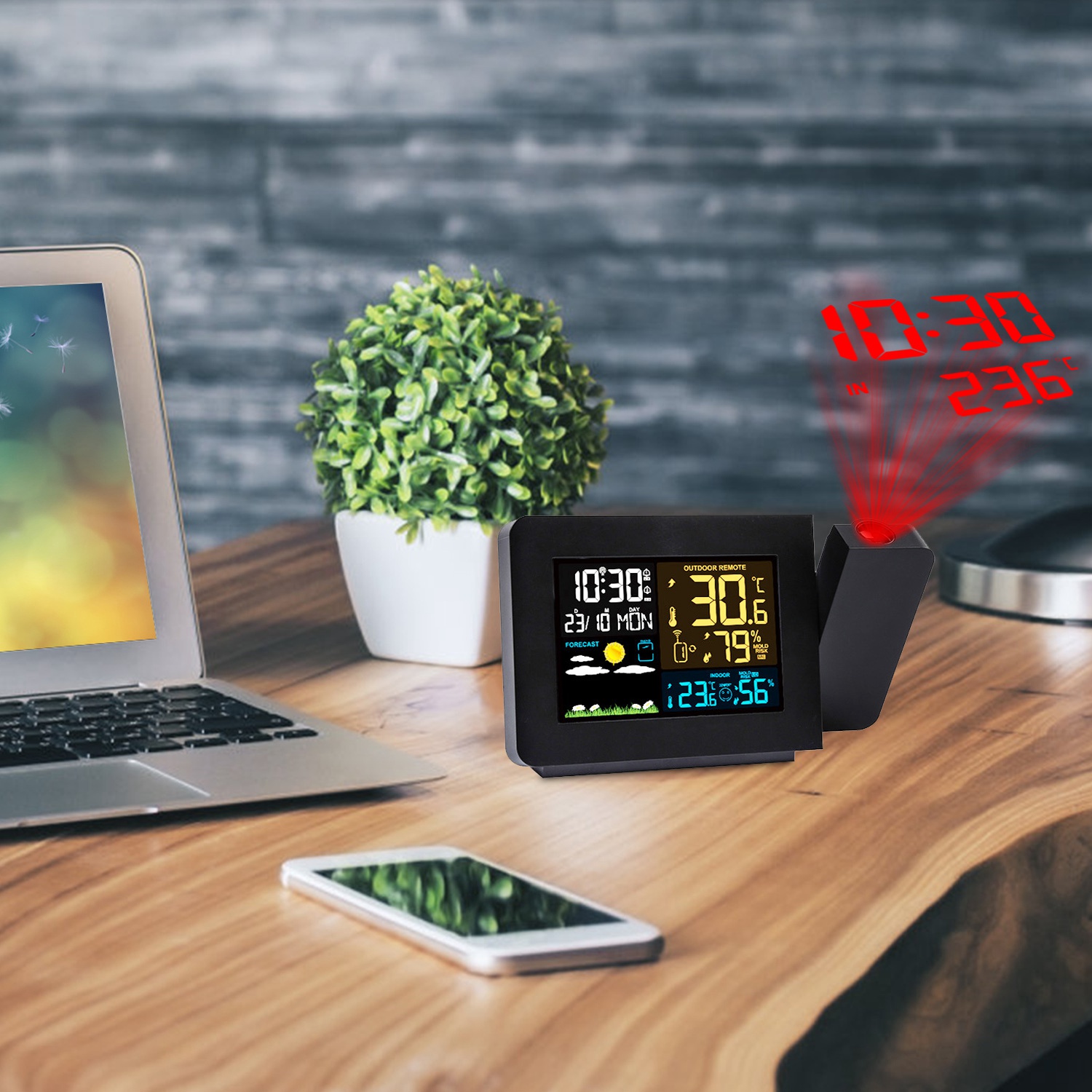 *Clear Time & Temperature Projection*:With 180° rotatable projection corner,our alarm clock can project ultra-clear time and temperature(indoor/outdoor temp displays alternately) onto wall or ceiling with optimal distance between 3.28-9.84ft. No need to turn your head to check the time. Besides,you can adjust the brightness(Low/High) according to your needs.