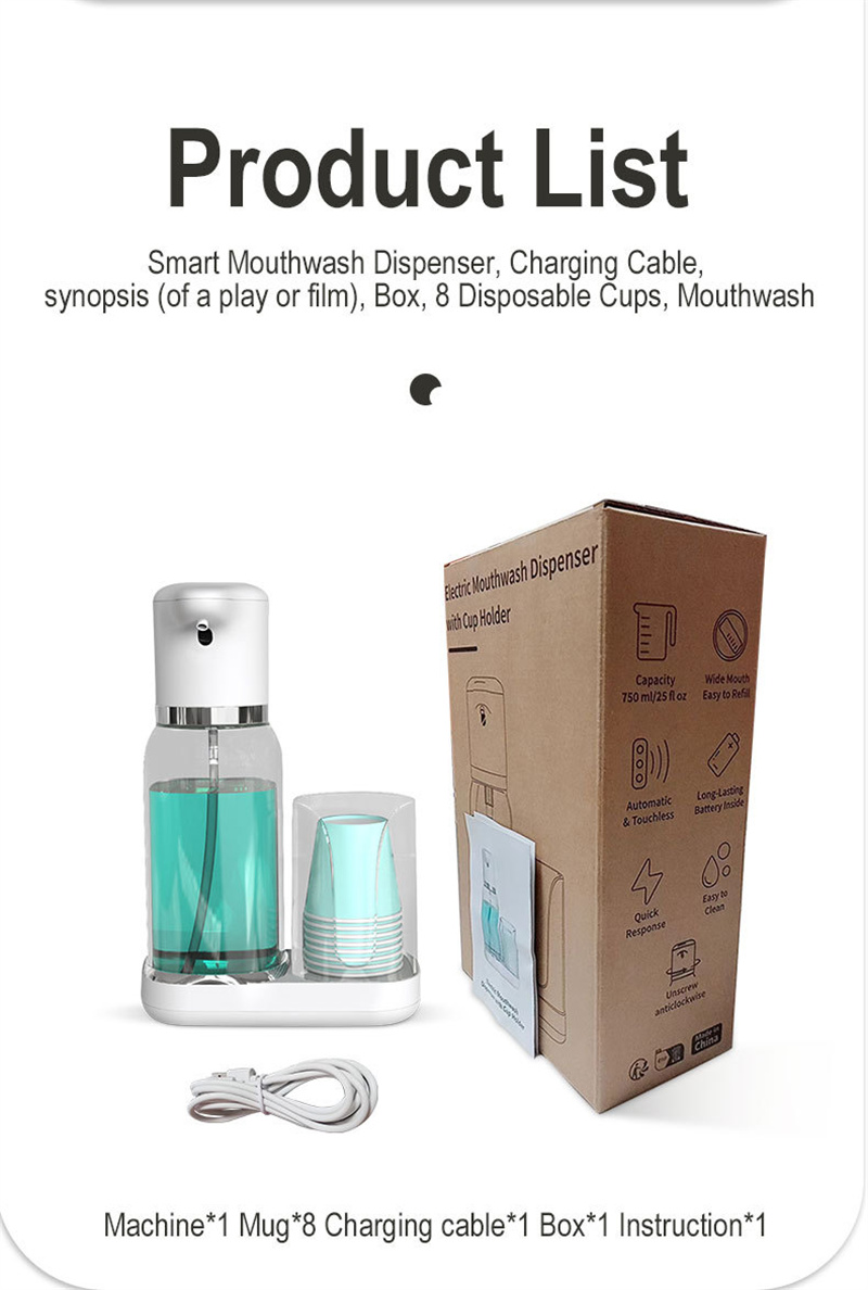 Intelligent mouthwash water dispenser * 1, charging cable * 1, instruction manual * 1, packaging box * 1, disposable water cup * 8
