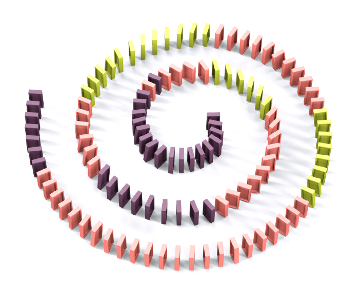 As the train moves forward, it will deposit the standing dominoes in a row.