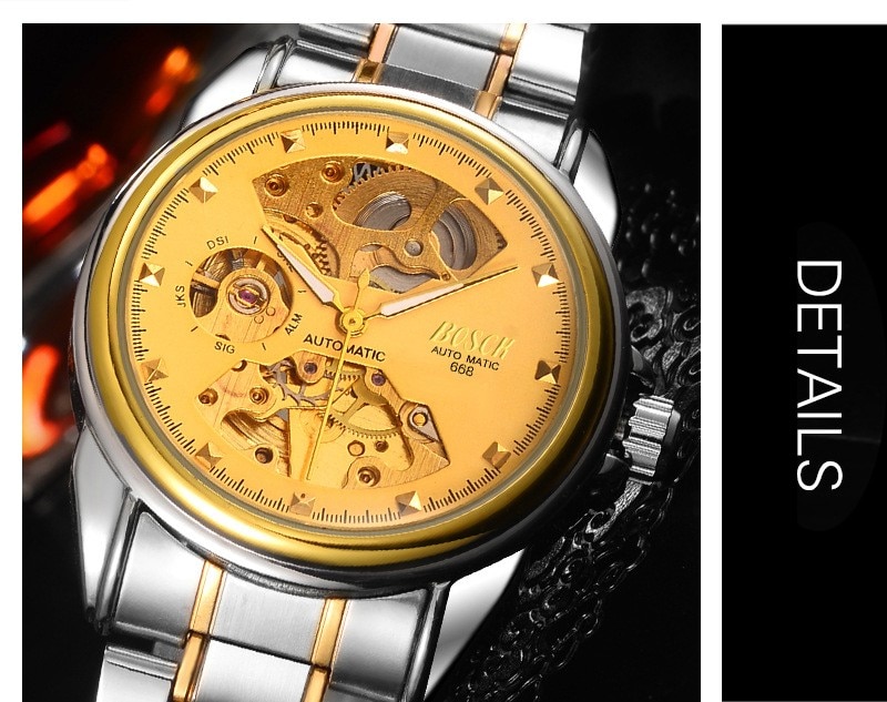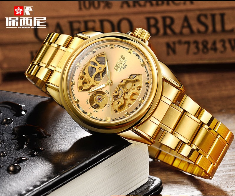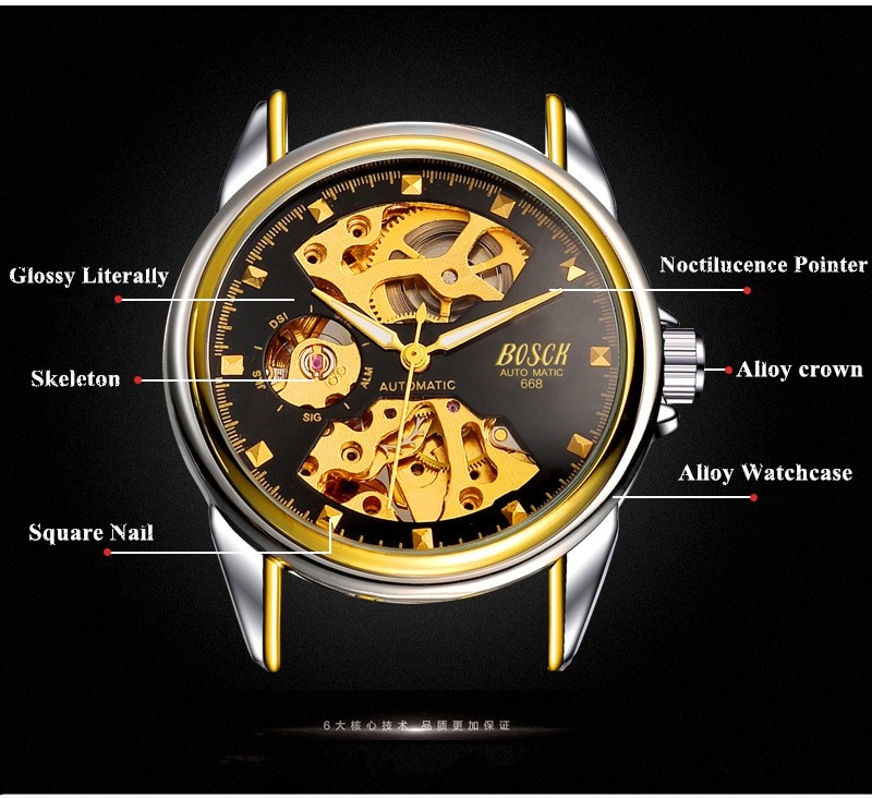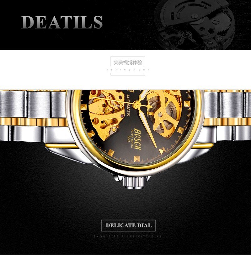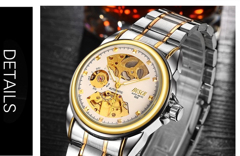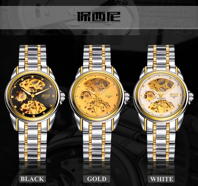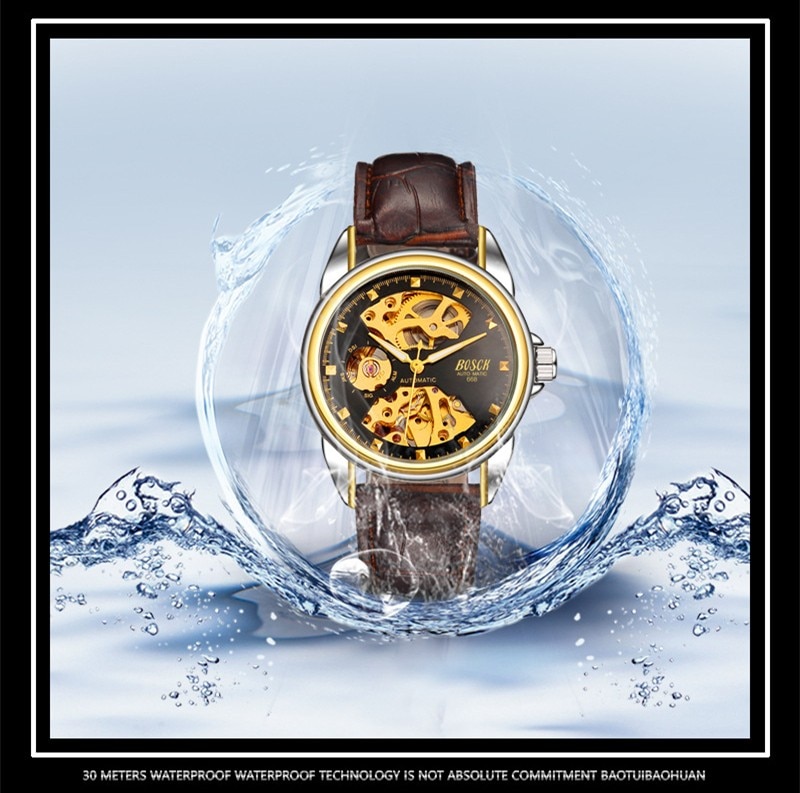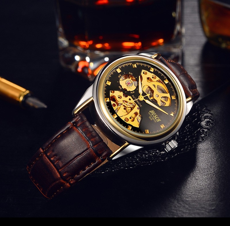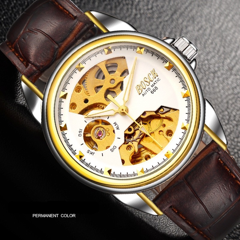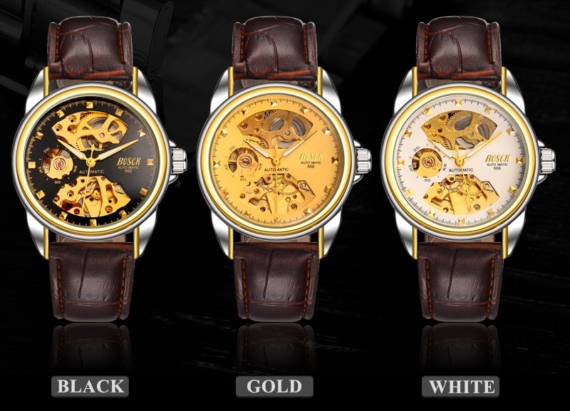 Brand name : BOSCK Style :Mechanical Wristwatches Dial Diameter : 38mm Case Thickness : 14mm Band Length : 23cm Band Width : 18mm Strap Material : Leather /Stainless Steel Water Resistant : 30m Dial Colors :Gold/White/Brown/Sliver