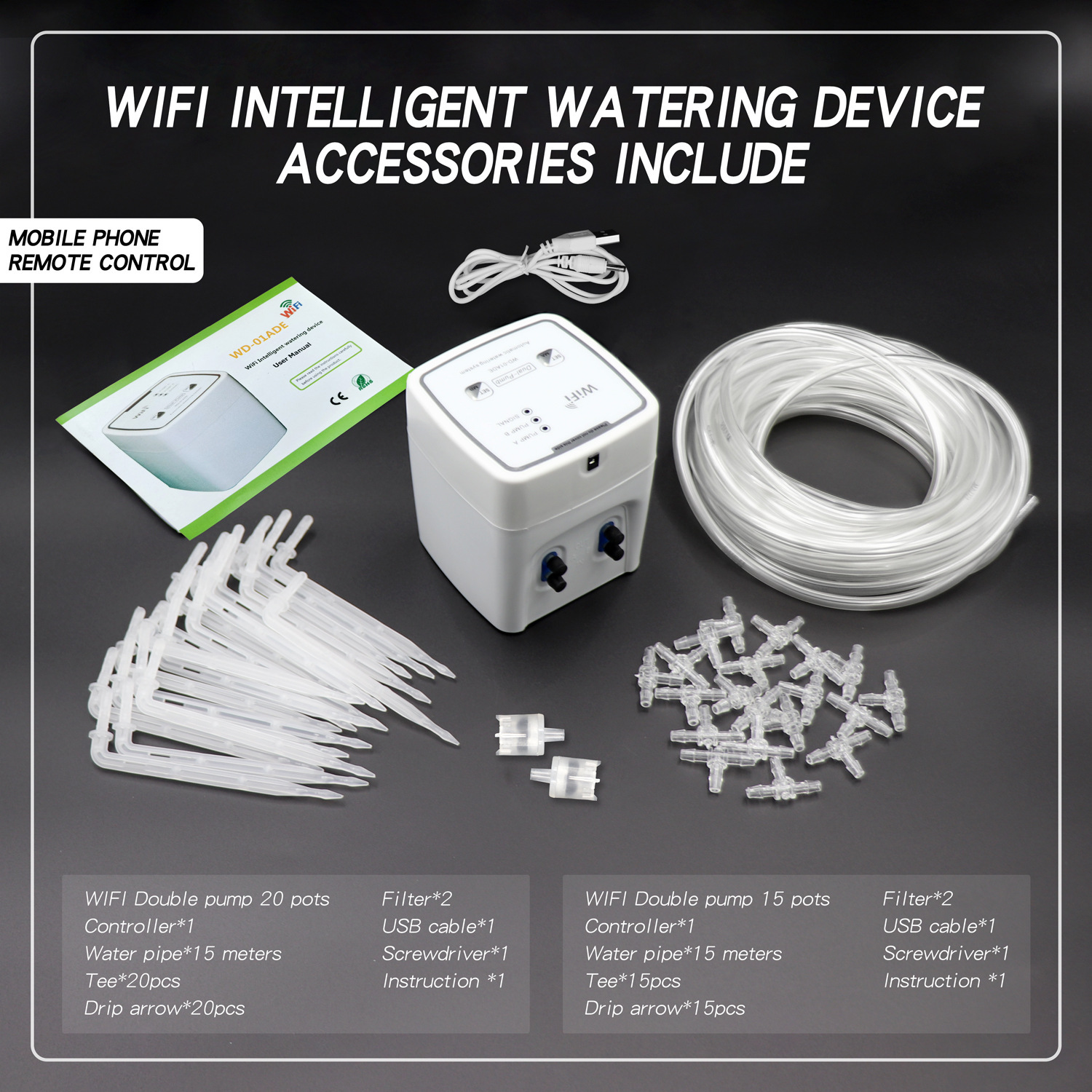 WIFI dual pump 20 pots: 1 WIFI dual pump host, 15 meter hose, 20 tees, 20 drip arrows, 2 filters, 1 USB cable, 1 screwdriver, and 1 instruction manual