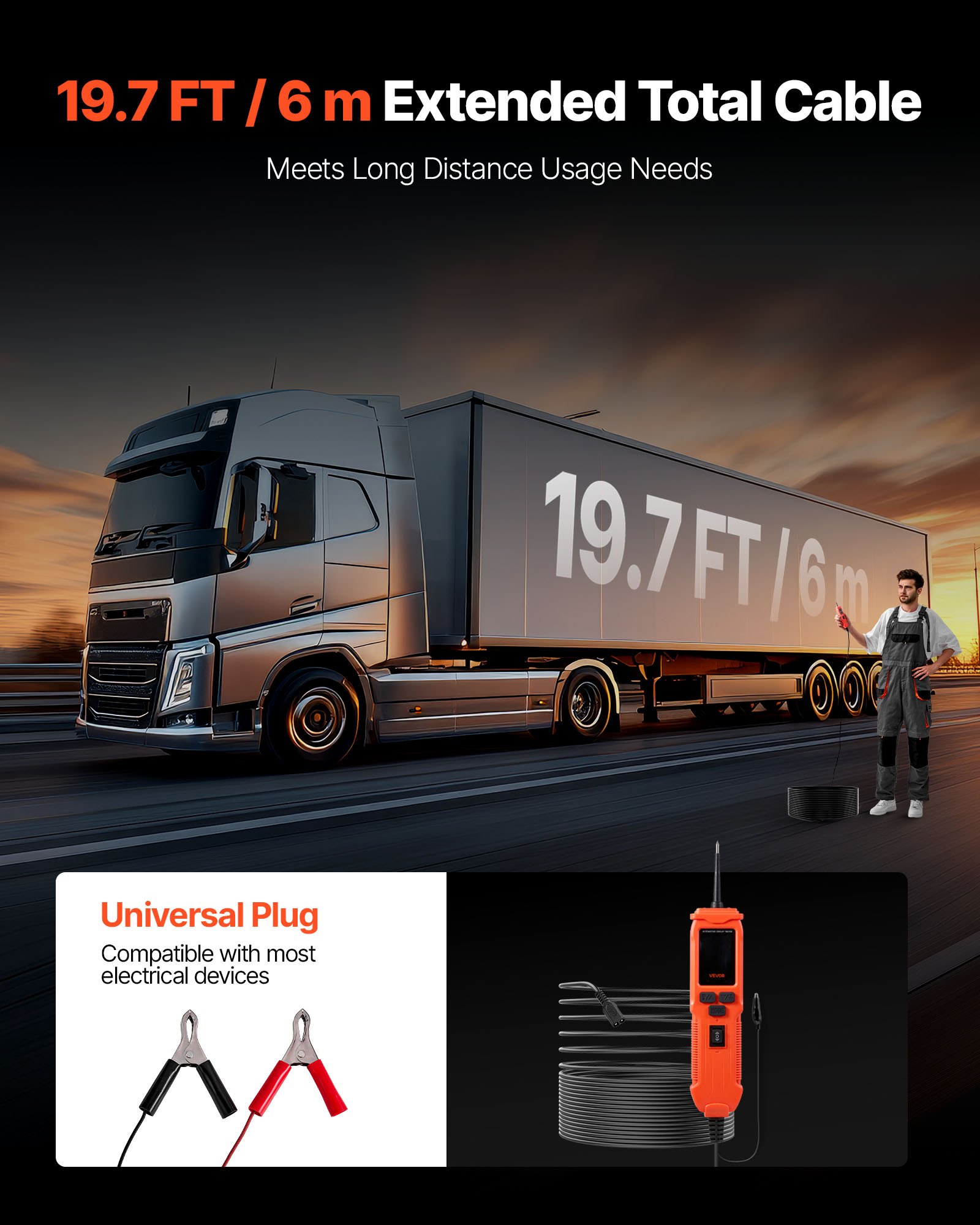 Long-Distance Usage: Our probe tester comes with a 19.7 ft cable. It includes universal connectors for most devices, supports testing polarity, current, resistance, frequency, continuity, duty cycle, fuel injection, diode check, and component activation