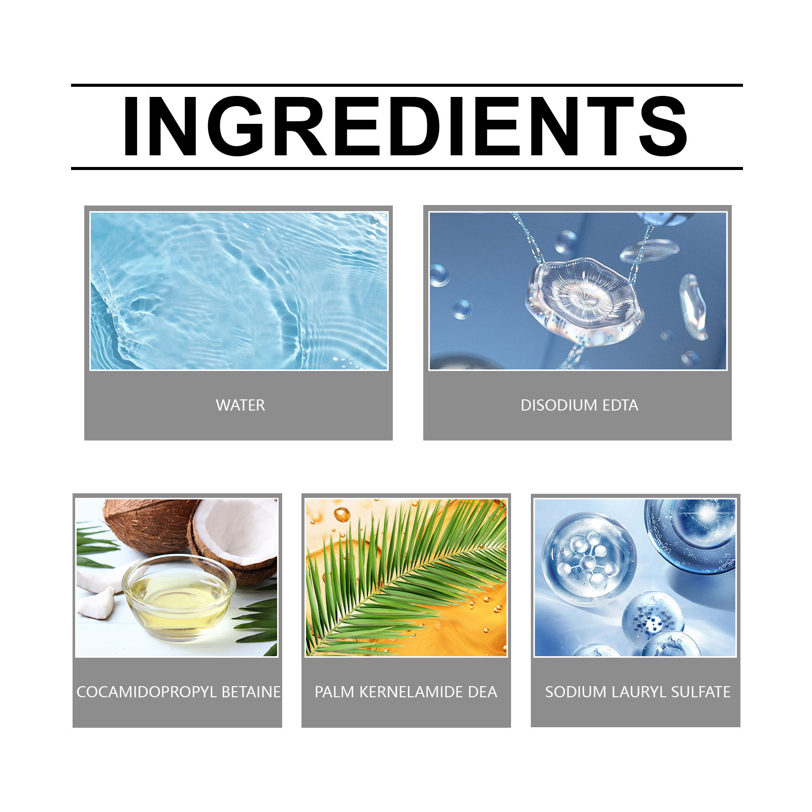 Ingredients: Water, disodium EDTA, coconut oil amidopropyl betaine, palm kernel oil amide DEA, lauryl alcohol Polyether sodium sulfate
