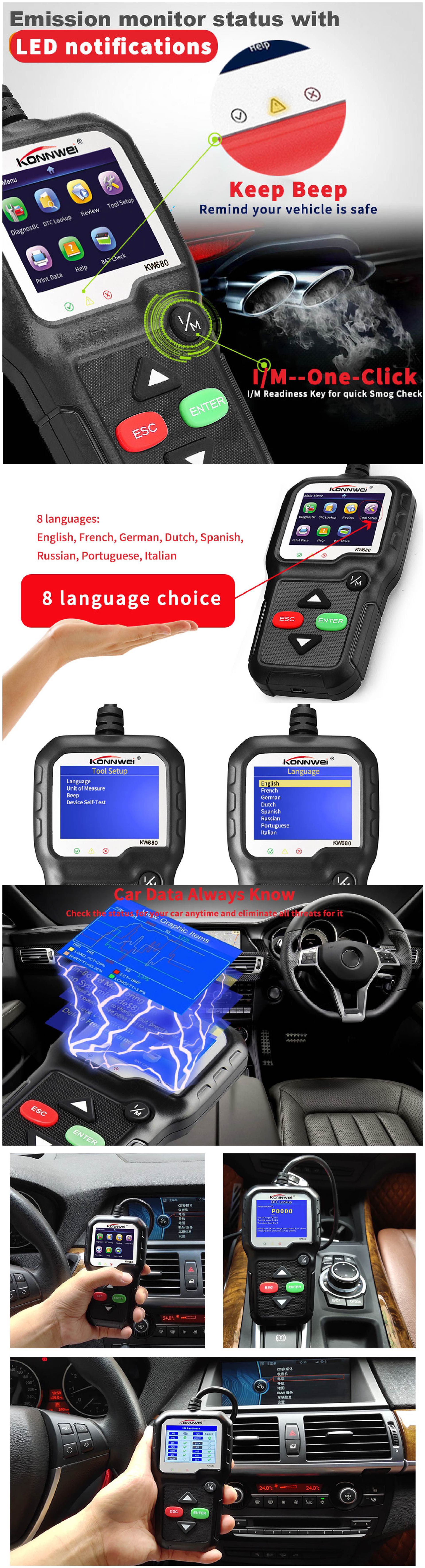 This product CAN only test 12V for compliance with OBD2,EOBD standards, which are one of the five agreements: CAN, J1850 PWM, J1850 VPW, ISO9141, KWP2000 for gasoline/diesel/hybrid vehicles.All 24V carts, trucks, and electric vehicles are not detectable.Support 8 languages: English, French, German, Dutch, Spanish, Russian, Portuguese, Italian;No Chinese.It can detect the voltage of automobile battery.The computer can print the car trouble code.