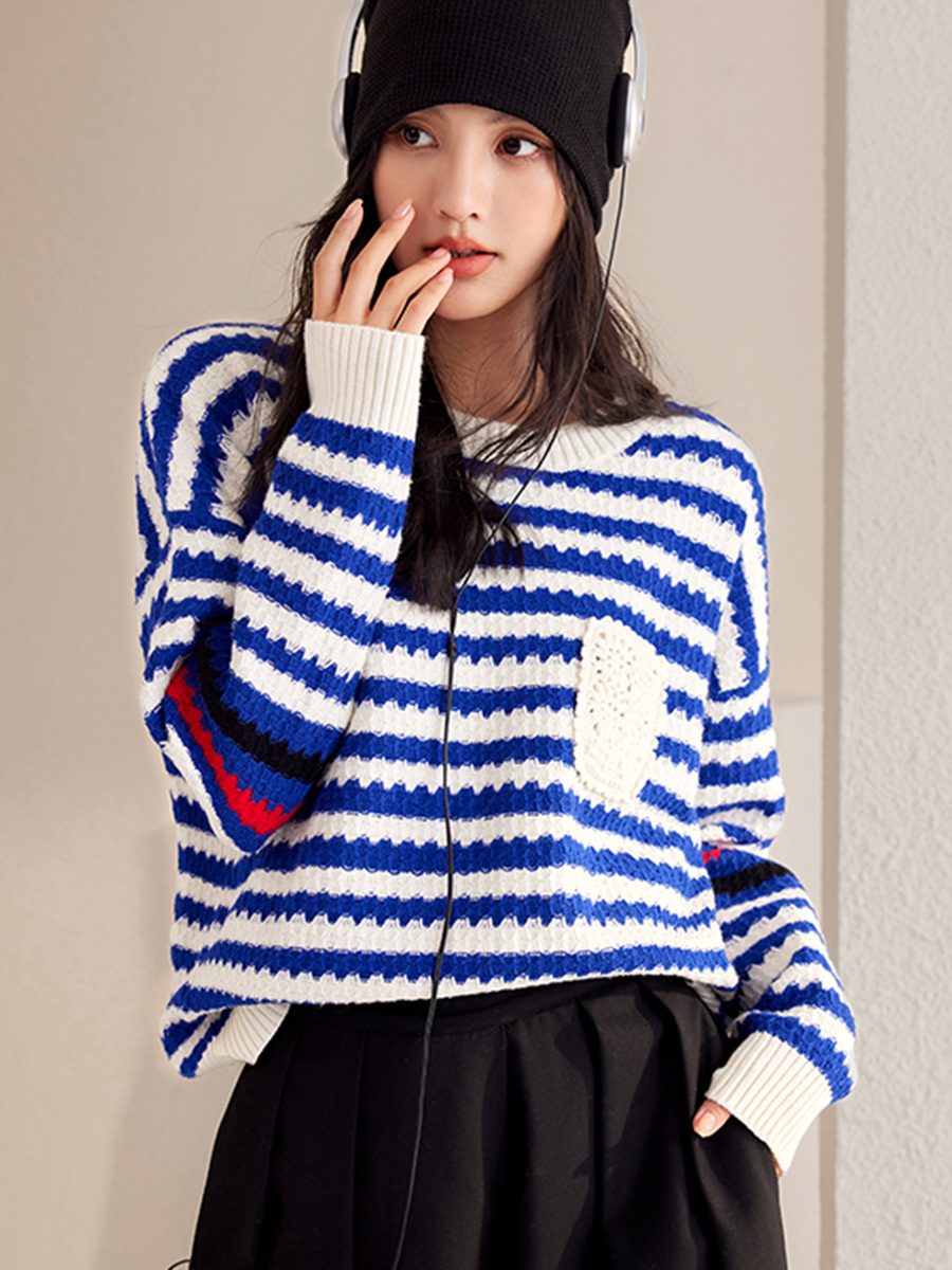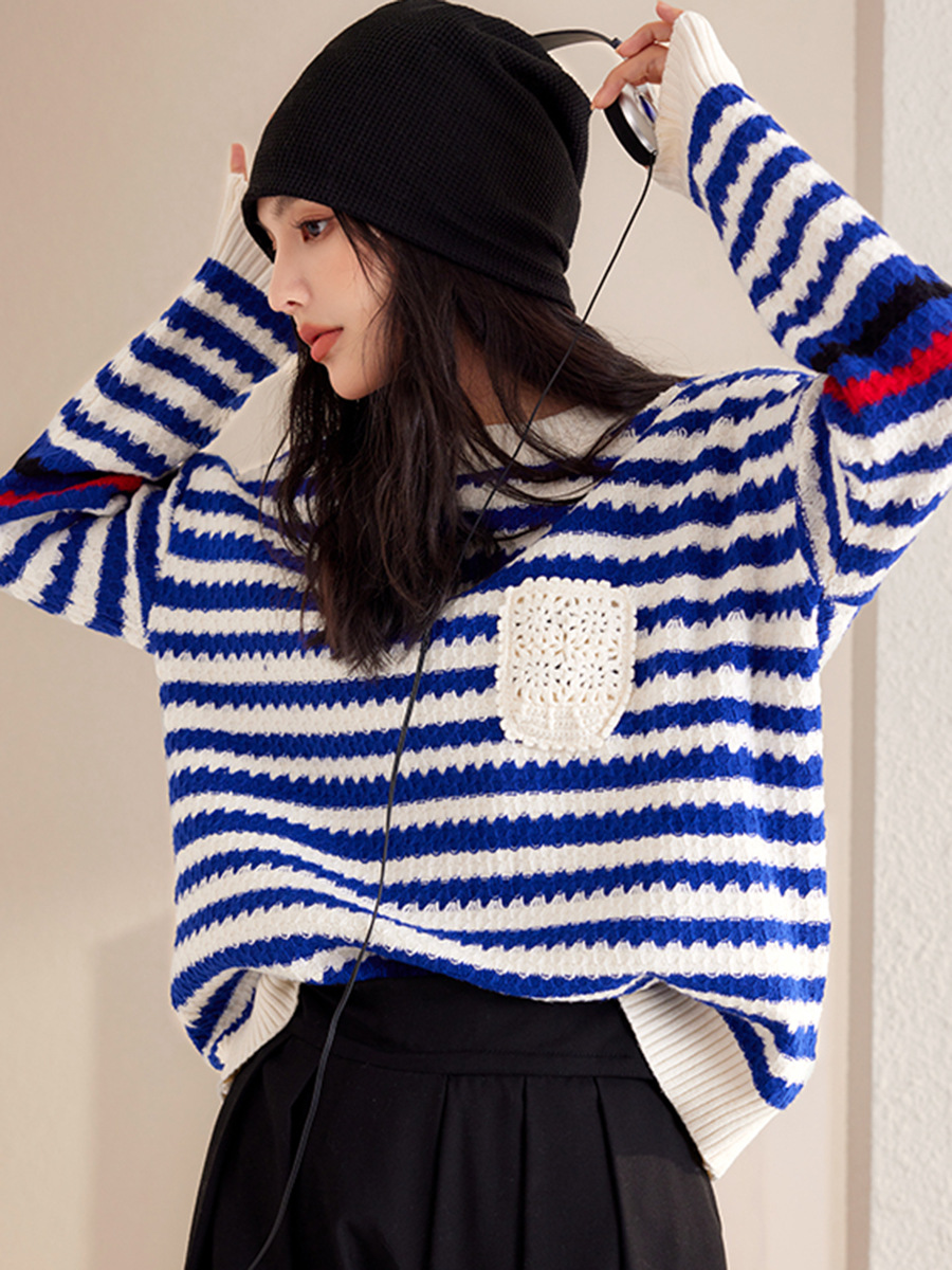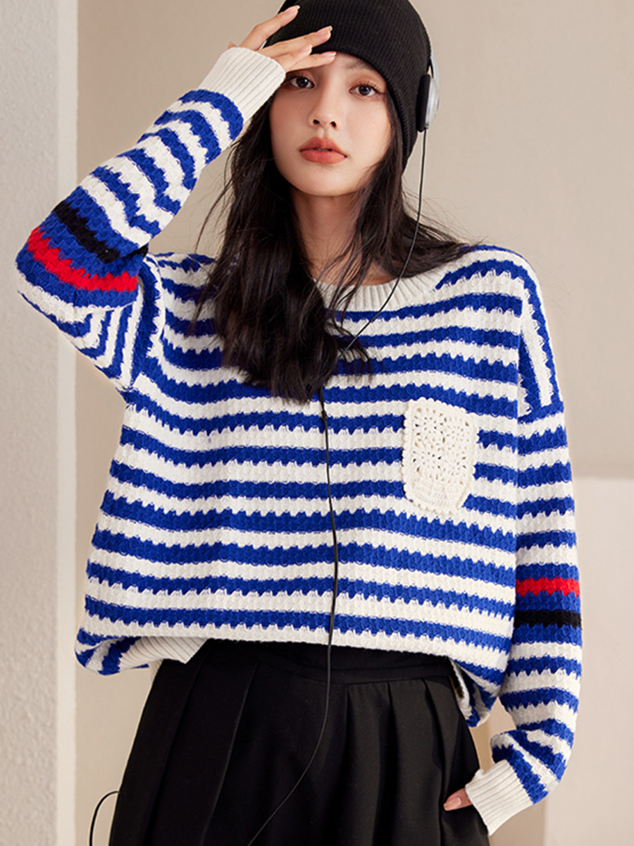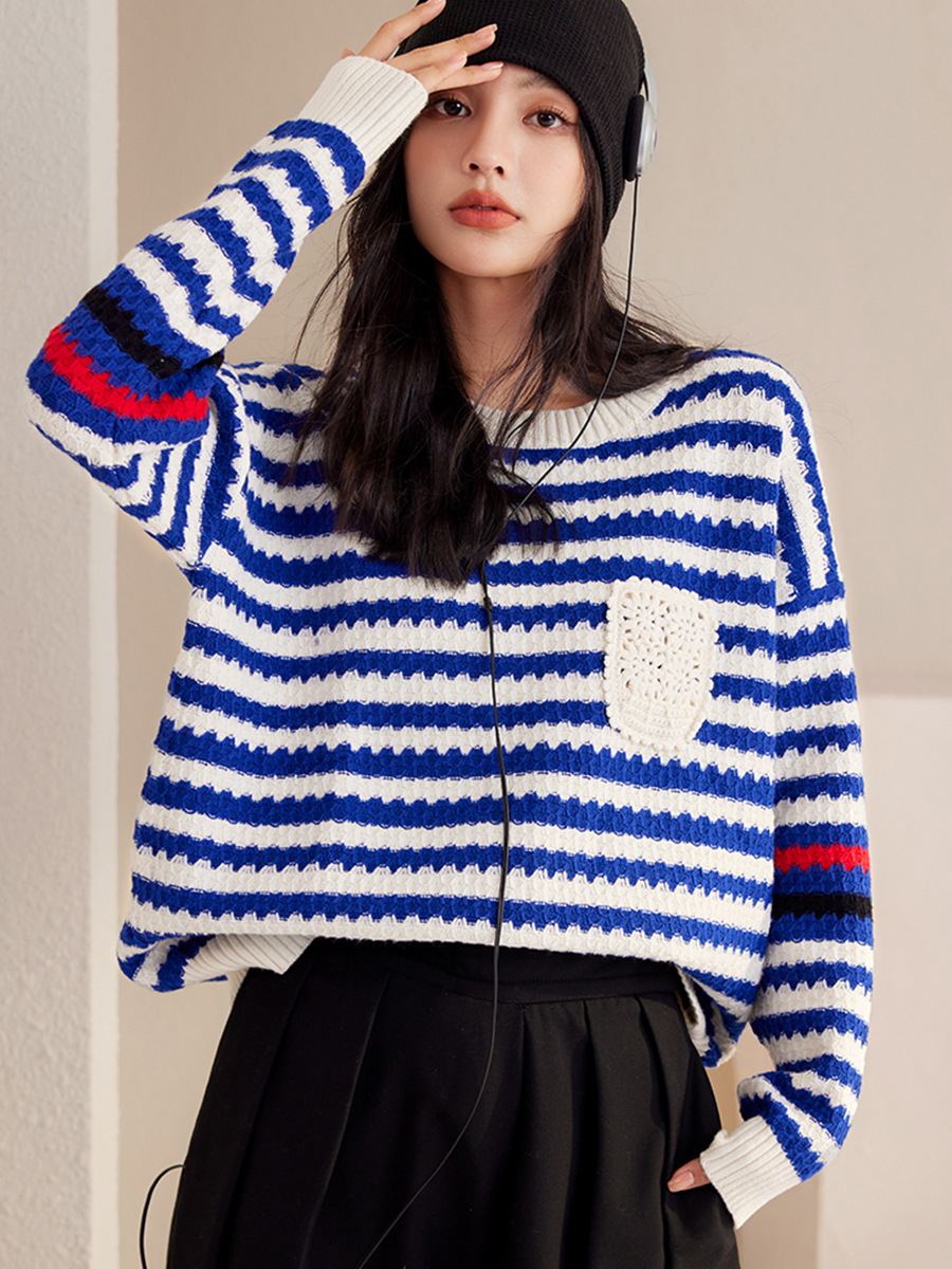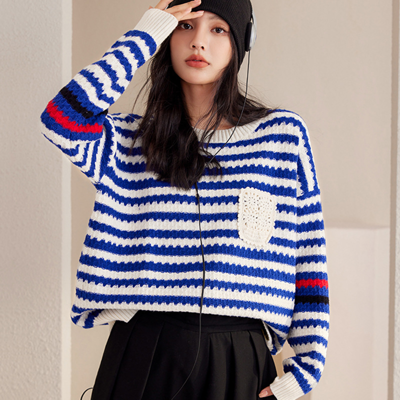Autumn And Winter Blue Women's Striped Pullover Fashionable Sweater