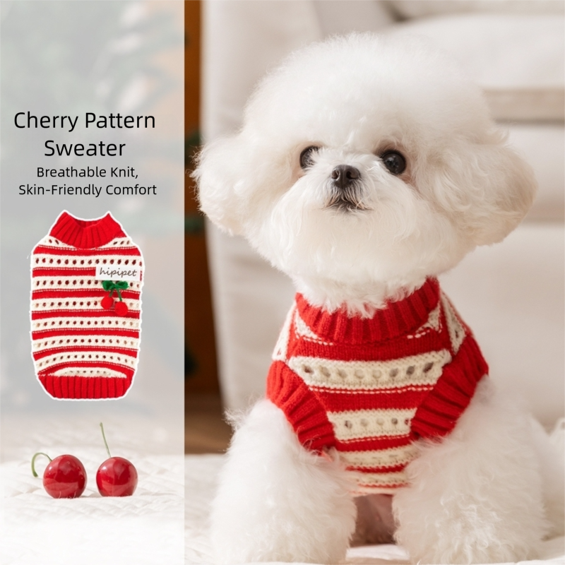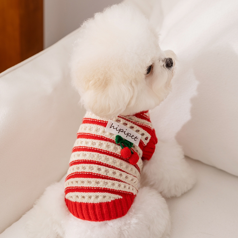 This knitted pullover features a red and white striped design, paired with exquisite cut-out knitting and 3D cherry embroidery, exuding both warmth and playfulness. The soft and breathable fabric ensures comfort. This sweater is perfect for casual outings or comfortable indoor weather. It combines cute cherry-colored details, timeless stripes and brand style, making it a must-have for pet parents who love to dress up their furry companions in a cute and comfortable way.