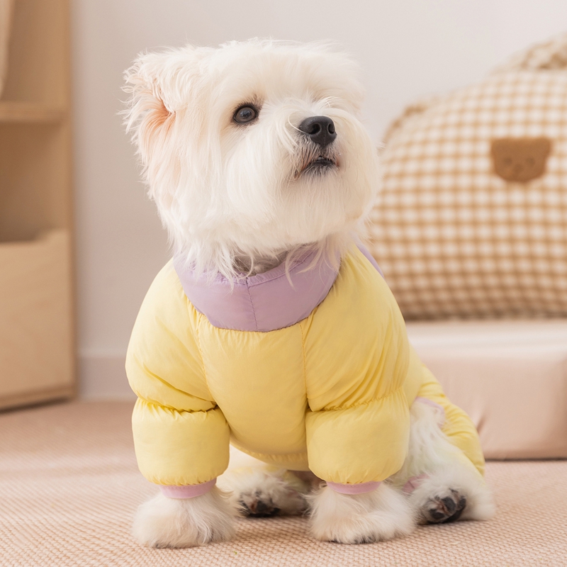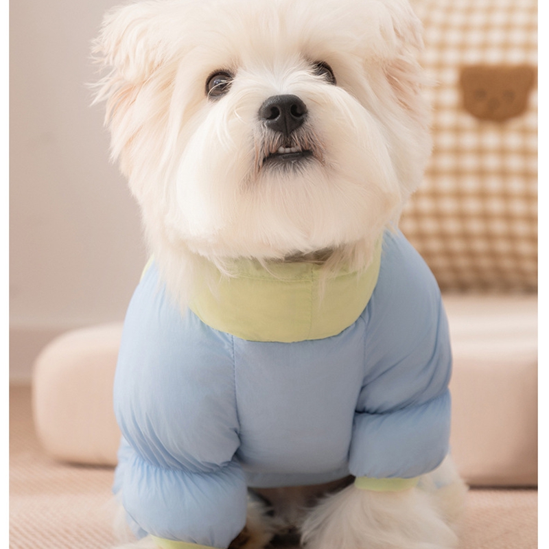 Keep your small dog cozy and stylish in this Color-Blocked Puffer Pet Jumpsuit! Available in two vibrant color combinations—light blue and green, plus yellow and purple—each jumpsuit features a padded puffer design for superior warmth, a smooth zipper closure. The full-body coverage ensures your pet stays snug during cold days, while the bold color blocking adds a trendy, playful vibe. Perfect for winter walks or indoor lounging, this jumpsuit combines comfort, functionality, and eye-catching style, making it a must-have for pet parents who want their furry companions to stay warm and fashionable all season.
