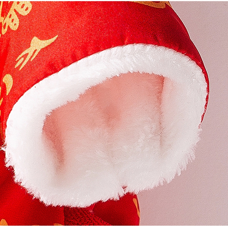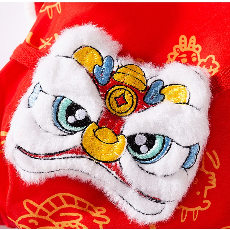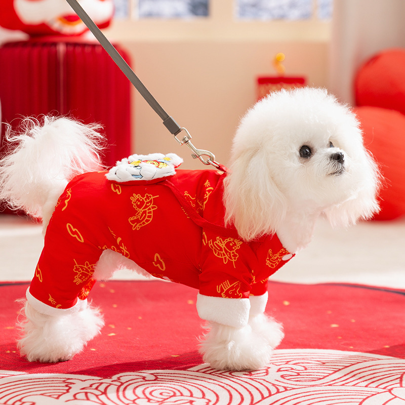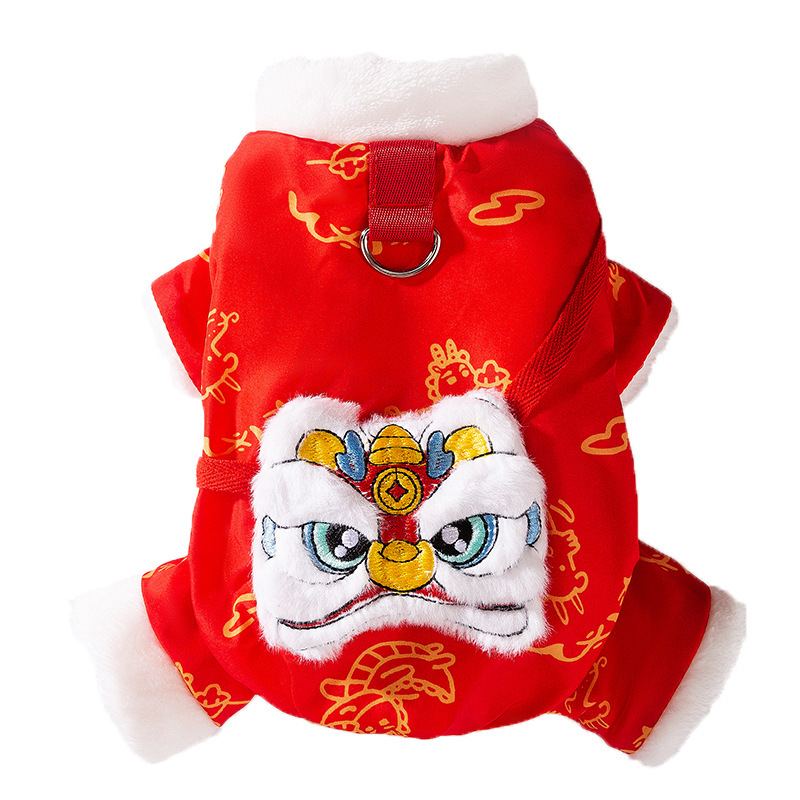 Celebrate Lunar New Year in authentic style with this Lion Dance Pet Jumpsuit! Available in vibrant red and elegant beige, each jumpsuit features intricate lion dance embroidery, traditional Chinese patterns, and a plush faux fur trim for cozy warmth. The integrated leash ring adds practicality for walks, while the playful lion head detail and festive color palette embody prosperity and cultural heritage. Perfect for Lunar New Year gatherings or festive photoshoots, this jumpsuit combines traditional craftsmanship, functional design, and eye-catching charm—ensuring your furry companion stands out with Lunar New Year elegance and stays snug during celebrations.