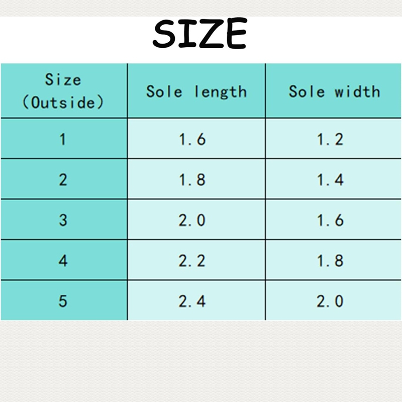 The outsole is 1.6 inches long and 1.2 inches wide. The sole is 1.8 inches long and 1.4 inches wide. The sole is 2 inches long and 1.6 inches wide. The sole is 2.2 inches long and 1.8 inches wide. The sole is 2.4 inches long and 2 inches wide.