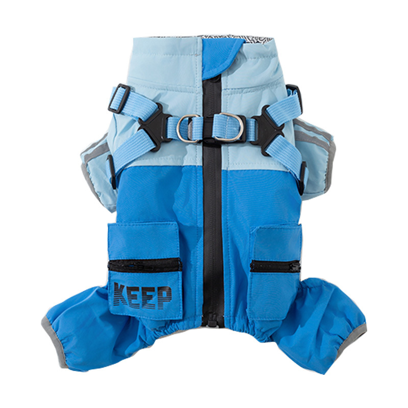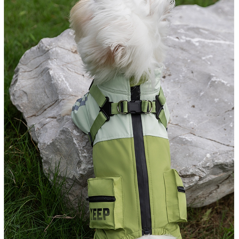 Equip your small dog for outdoor adventures with this Reflective Outdoor Pet Jumpsuit! Available in bold blue and earthy green, each jumpsuit features a built-in harness, reflective stripes for visibility, a functional pocket, and waterproof fabric. The full-body design protects against elements, while the harness integration ensures easy leash attachment. Perfect for hikes, walks, or rainy-day outings, this jumpsuit combines practicality, safety, and adventure-ready style, making it a must-have for pet parents who love exploring the outdoors with their furry companions.