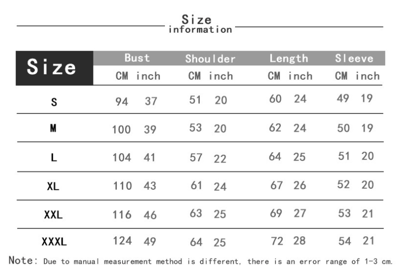 1. Asian sizes are 1 to 2 sizes smaller than European and American people. Choose the larger size if your size between two sizes. Please allow 2-3cm differences due to manual measurement. 2. Please check the size chart carefully before you buy the item, if you don't know how to choose size, please contact our customer service. 3.As you know, the different computers display colors differently, the color of the actual item may vary slightly from the following images.