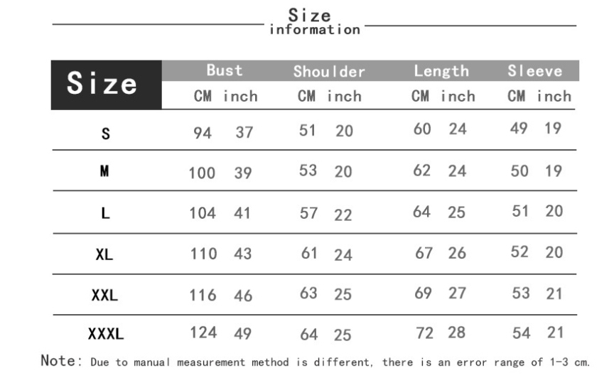 1. Asian sizes are 1 to 2 sizes smaller than European and American people. Choose the larger size if your size between two sizes. Please allow 2-3cm differences due to manual measurement. 2. Please check the size chart carefully before you buy the item, if you don't know how to choose size, please contact our customer service. 3.As you know, the different computers display colors differently, the color of the actual item may vary slightly from the following images.